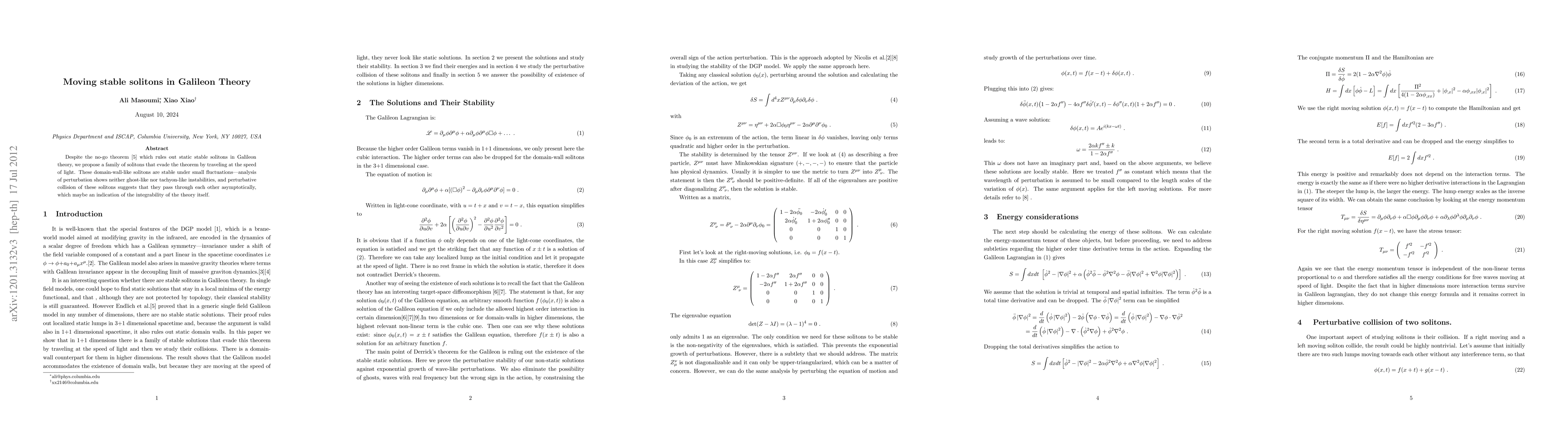 This paper proposes a family of moving solitons in Galileon theory that circumvent the no-go theorem prohibiting static stable solitons by traveling at the speed of light. The solitons are stable under perturbations and exhibit integrability-like behavior during perturbative collisions.