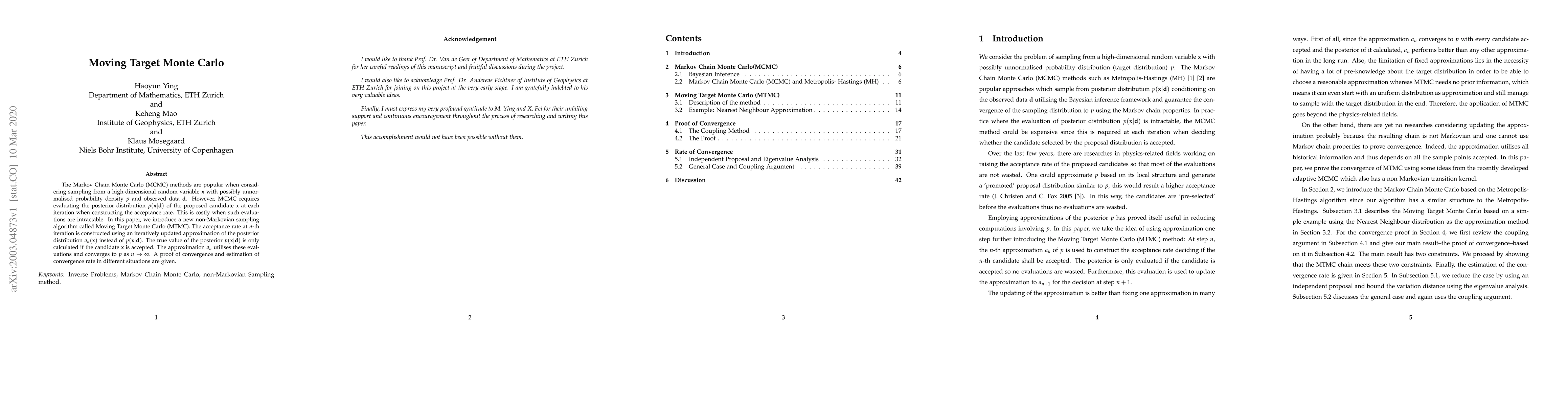 The Markov Chain Monte Carlo (MCMC) methods are popular when considering sampling from a high-dimensional random variable $\mathbf{x}$ with possibly unnormalised probability density $p$ and observed data $\mathbf{d}$. However, MCMC requires evaluating the posterior distribution $p(\mathbf{x}|\mathbf{d})$ of the proposed candidate $\mathbf{x}$ at each iteration when constructing the acceptance rate. This is costly when such evaluations are intractable. In this paper, we introduce a new non-Markovian sampling algorithm called Moving Target Monte Carlo (MTMC). The acceptance rate at $n$-th iteration is constructed using an iteratively updated approximation of the posterior distribution $a_n(\mathbf{x})$ instead of $p(\mathbf{x}|\mathbf{d})$. The true value of the posterior $p(\mathbf{x}|\mathbf{d})$ is only calculated if the candidate $\mathbf{x}$ is accepted. The approximation $a_n$ utilises these evaluations and converges to $p$ as $n \rightarrow \infty$. A proof of convergence and estimation of convergence rate in different situations are given.