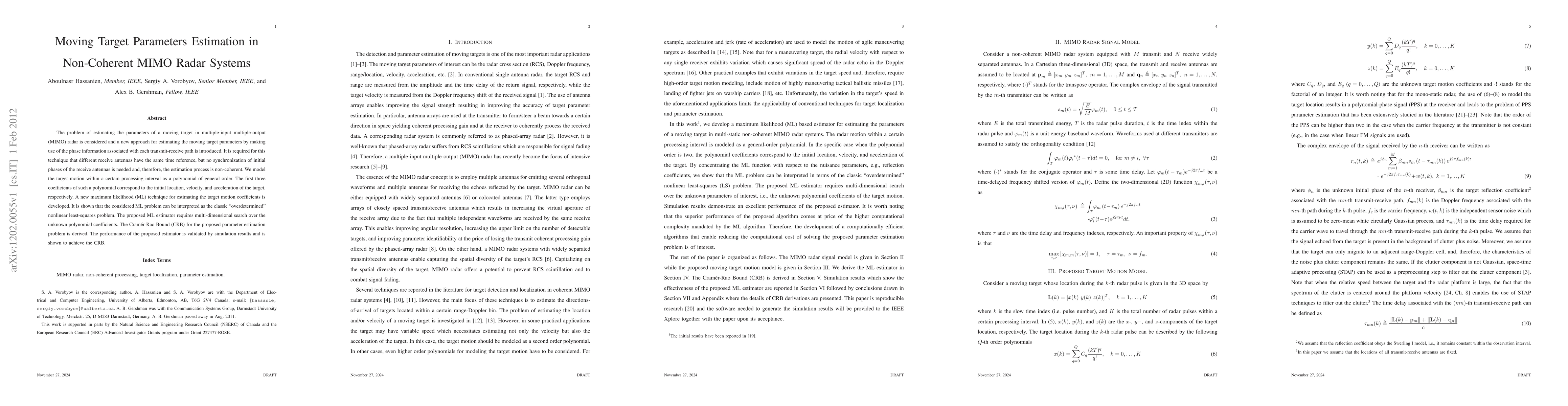 This paper introduces a non-coherent MIMO radar technique for estimating moving target parameters using phase information across transmit-receive paths. A maximum likelihood estimator is developed to determine target motion coefficients modeled as a polynomial, achieving performance close to the Cram\'er-Rao Bound through simulations.