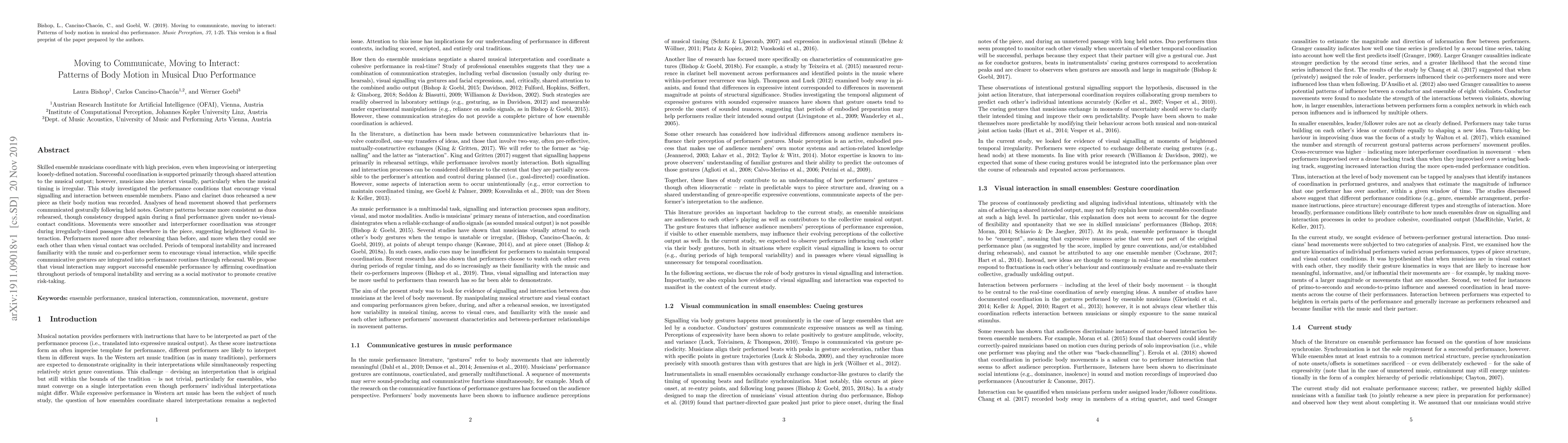 Skilled ensemble musicians coordinate with high precision, even when improvising or interpreting loosely-defined notation. Successful coordination is supported primarily through shared attention to the musical output; however, musicians also interact visually, particularly when the musical timing is irregular. This study investigated the performance conditions that encourage visual signalling and interaction between ensemble members. Piano and clarinet duos rehearsed a new piece as their body motion was recorded. Analyses of head movement showed that performers communicated gesturally following held notes. Gesture patterns became more consistent as duos rehearsed, though consistency dropped again during a final performance given under no-visual-contact conditions. Movements were smoother and interperformer coordination was stronger during irregularly-timed passages than elsewhere in the piece, suggesting heightened visual interaction. Performers moved more after rehearsing than before, and more when they could see each other than when visual contact was occluded. Periods of temporal instability and increased familiarity with the music and co-performer seem to encourage visual interaction, while specific communicative gestures are integrated into performance routines through rehearsal. We propose that visual interaction may support successful ensemble performance by affirming coordination throughout periods of temporal instability and serving as a social motivator to promote creative risk-taking.