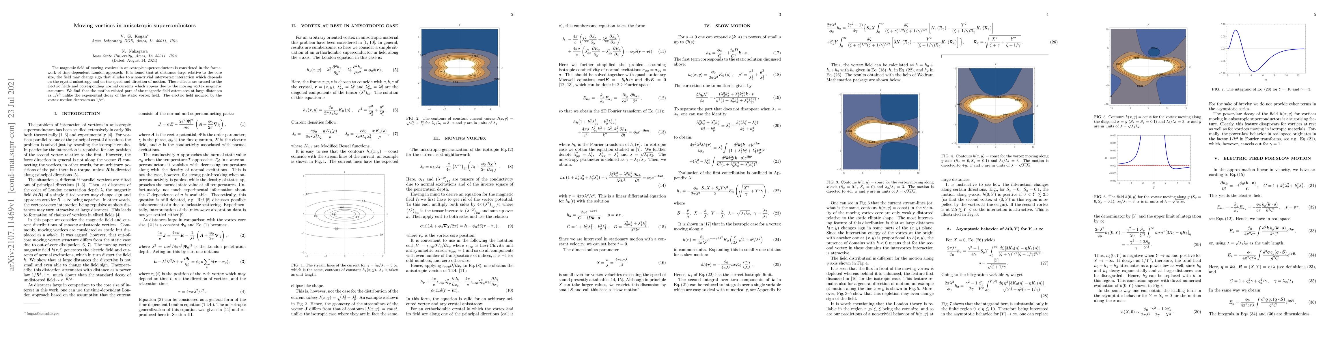 This study explores the magnetic field of moving vortices in anisotropic superconductors using the time-dependent London approach, revealing a non-trivial intervortex interaction influenced by crystal anisotropy and vortex motion parameters. The magnetic field decay is found to be $1/r^3$ at large distances, contrasting with the static vortex's exponential decay.