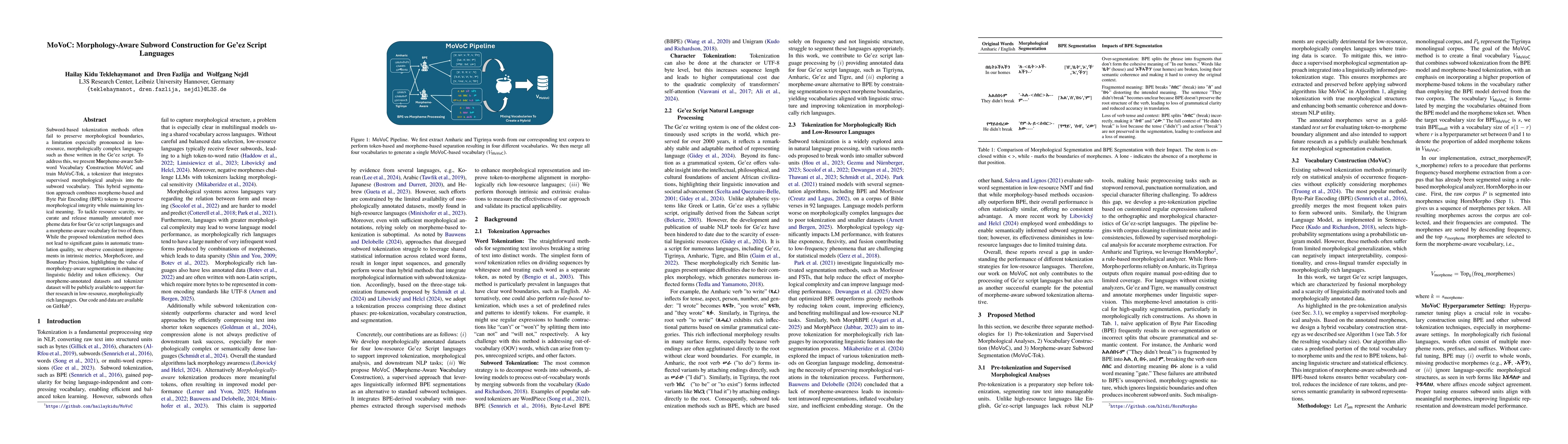 Subword-based tokenization methods often fail to preserve morphological boundaries, a limitation especially pronounced in low-resource, morphologically complex languages such as those written in the Geez script. To address this, we present MoVoC (Morpheme-aware Subword Vocabulary Construction) and train MoVoC-Tok, a tokenizer that integrates supervised morphological analysis into the subword vocabulary. This hybrid segmentation approach combines morpheme-based and Byte Pair Encoding (BPE) tokens to preserve morphological integrity while maintaining lexical meaning. To tackle resource scarcity, we curate and release manually annotated morpheme data for four Geez script languages and a morpheme-aware vocabulary for two of them. While the proposed tokenization method does not lead to significant gains in automatic translation quality, we observe consistent improvements in intrinsic metrics, MorphoScore, and Boundary Precision, highlighting the value of morphology-aware segmentation in enhancing linguistic fidelity and token efficiency. Our morpheme-annotated datasets and tokenizer will be publicly available to support further research in low-resource, morphologically rich languages. Our code and data are available on GitHub: https://github.com/hailaykidu/MoVoC