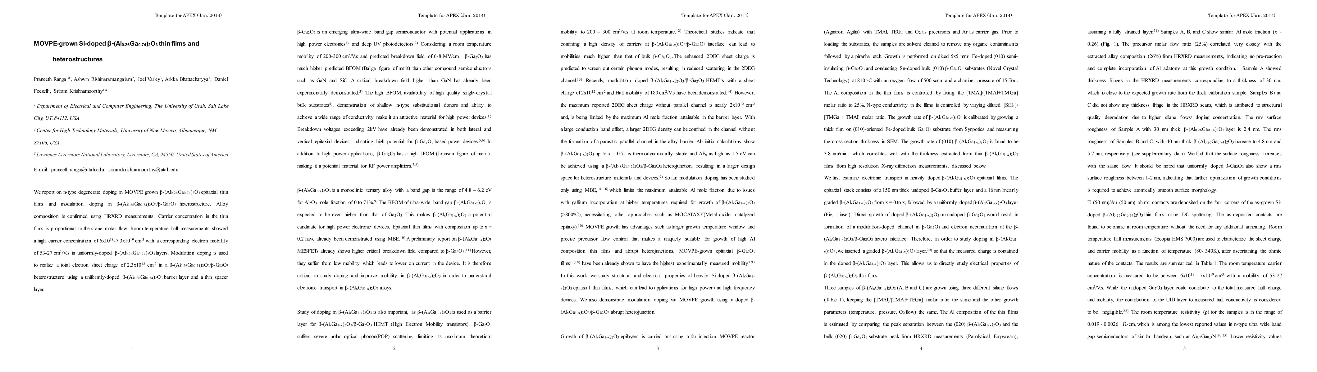 This paper reports on n-type degenerate doping in MOVPE-grown Si-doped \b{eta}-(Al0.26Ga0.74)2O3 thin films and modulation doping in \b{eta}-(Al0.26Ga0.74)2O3/\b{eta}-Ga2O3 heterostructures, achieving high carrier concentrations and electron mobility.