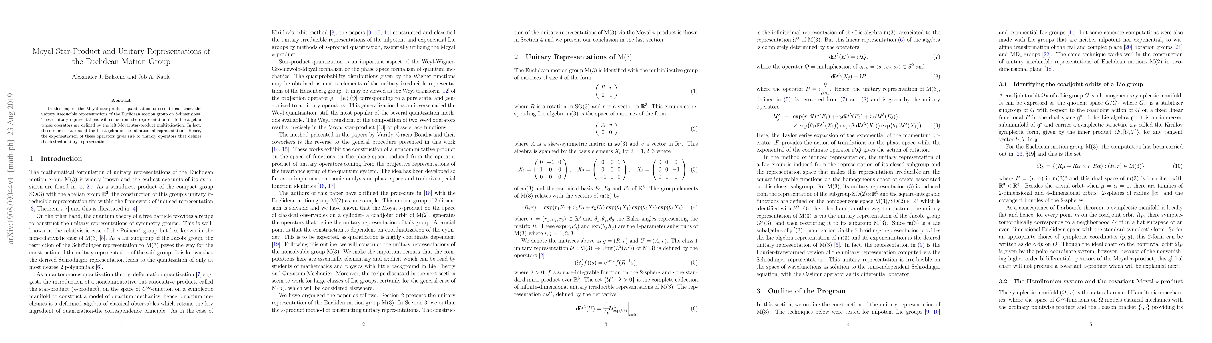 This paper utilizes the Moyal star-product quantization to construct unitary irreducible representations of the Euclidean motion group in three dimensions. The representations arise from the infinitesimal representation of its Lie algebra, with exponentiation of the Lie algebra operators yielding the desired unitary operators.