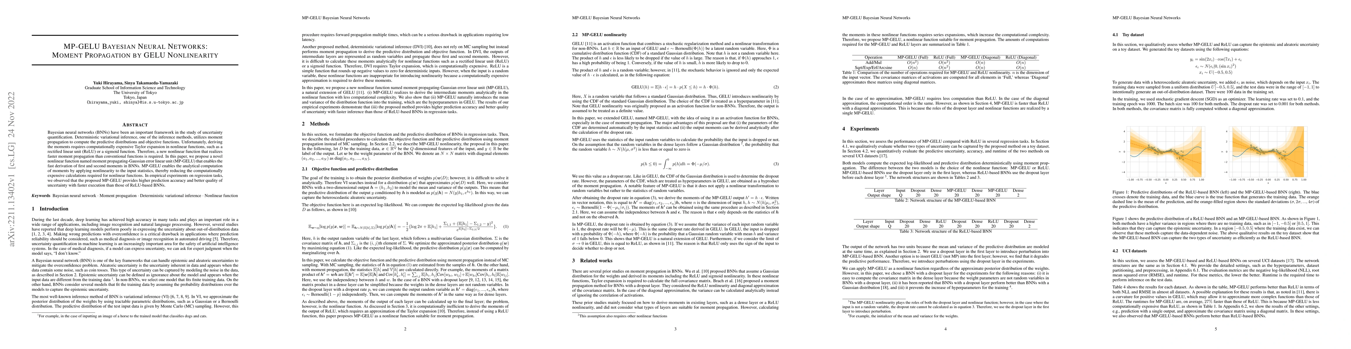 This paper introduces MP-GELU, a novel nonlinear function for Bayesian neural networks that facilitates faster computation of first and second moments compared to traditional functions like ReLU. Empirical results show improved prediction accuracy and uncertainty quantification with quicker execution times.