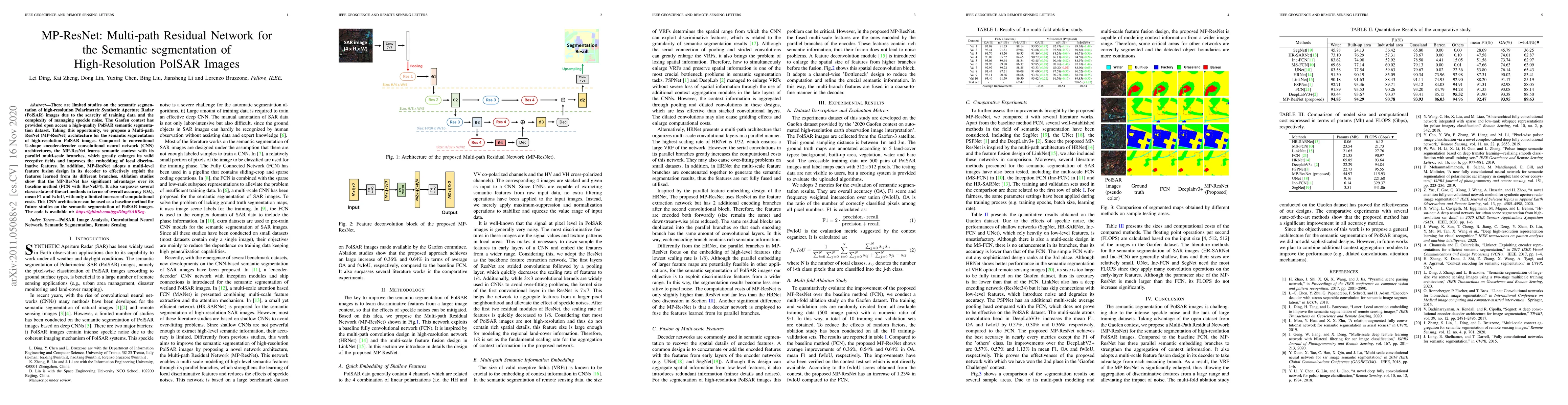 The paper proposes MP-ResNet, a Multi-path Residual Network architecture for semantic segmentation of high-resolution PolSAR images, which utilizes parallel multi-scale branches and multi-level feature fusion to improve feature embedding and context learning. The MP-ResNet outperforms baseline and state-of-the-art methods in accuracy metrics while maintaining manageable computational costs.