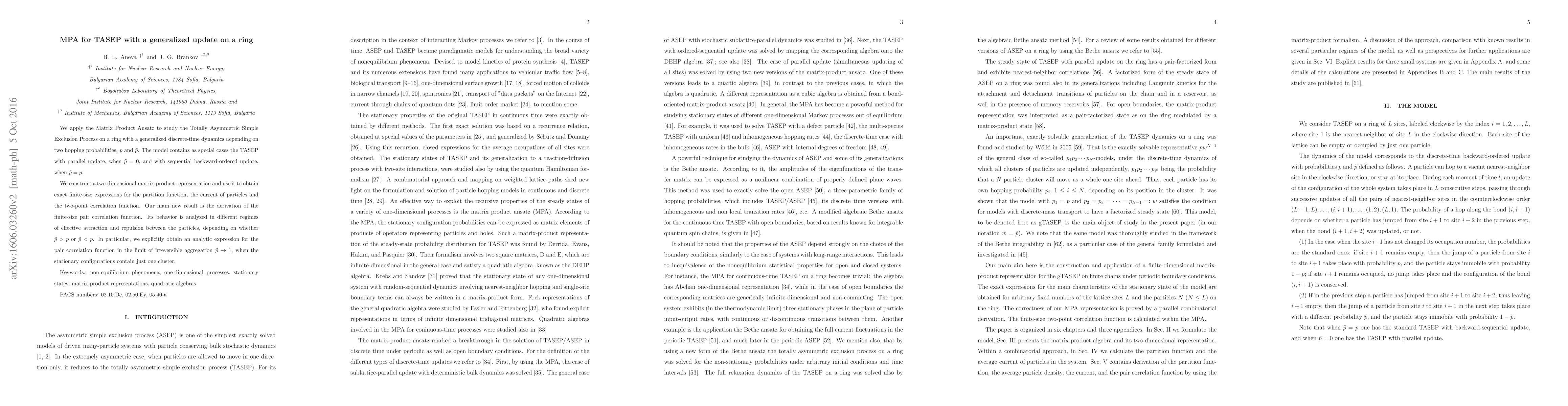 This paper uses the Matrix Product Ansatz to analyze a generalized Totally Asymmetric Simple Exclusion Process on a ring, deriving exact finite-size expressions for the partition function, particle current, and two-point correlation function. The study reveals distinct pair correlation behaviors depending on the hopping probabilities, with a special focus on irreversible aggregation.