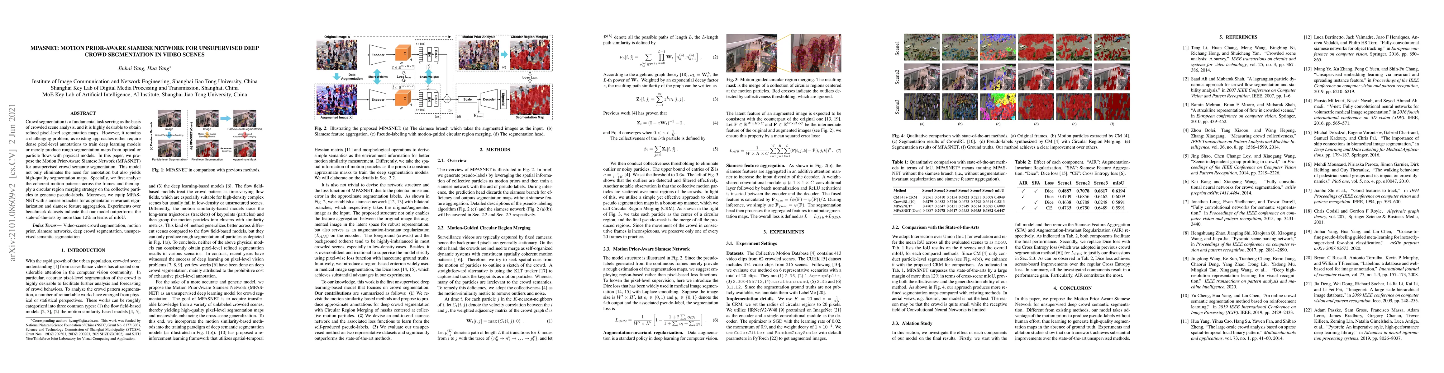 The MPASNET model proposes an unsupervised deep learning approach for crowd segmentation in videos by leveraging motion priors and siamese network features, achieving high-quality segmentation maps without requiring dense annotations. The model outperforms existing methods by over 12% in mean Intersection over Union (mIoU) on benchmark datasets.