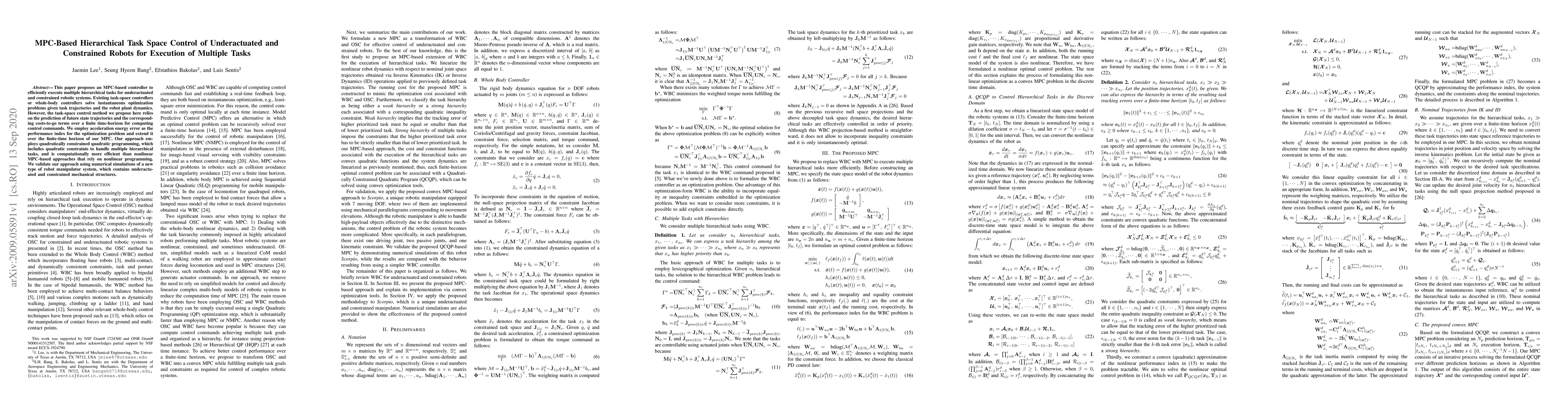 This paper introduces an MPC-based hierarchical task space controller for underactuated and constrained robots, optimizing multiple tasks through predicted future state trajectories and cost-to-go terms. The approach uses acceleration energy error and quadratically constrained quadratic programming for efficient computation, validated via simulations of a new robot manipulator system.