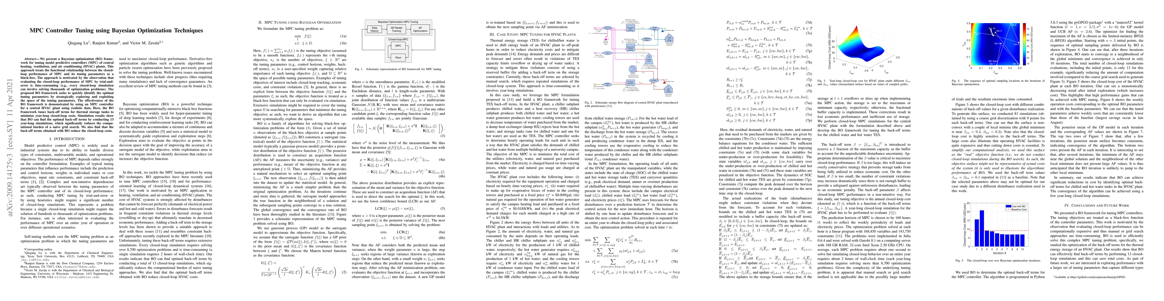 We present a Bayesian optimization (BO) framework for tuning model predictive controllers (MPC) of central heating, ventilation, and air conditioning (HVAC) plants. This approach treats the functional relationship between the closed-loop performance of MPC and its tuning parameters as a black-box. The approach is motivated by the observation that evaluating the closed-loop performance of MPC by trial-and-error is time-consuming (e.g., every closed-loop simulation can involve solving thousands of optimization problems). The proposed BO framework seeks to quickly identify the optimal tuning parameters by strategically exploring and exploiting the space of the tuning parameters. The effectiveness of the BO framework is demonstrated by using an MPC controller for a central HVAC plant using realistic data. Here, the BO framework tunes back-off terms for thermal storage tanks to minimize year-long closed-loop costs. Simulation results show that BO can find the optimal back-off terms by conducting 13 year-long simulations, which significantly reduces the computational burden of a naive grid search. We also find that the back-off terms obtained with BO reduce the closed-loop costs.