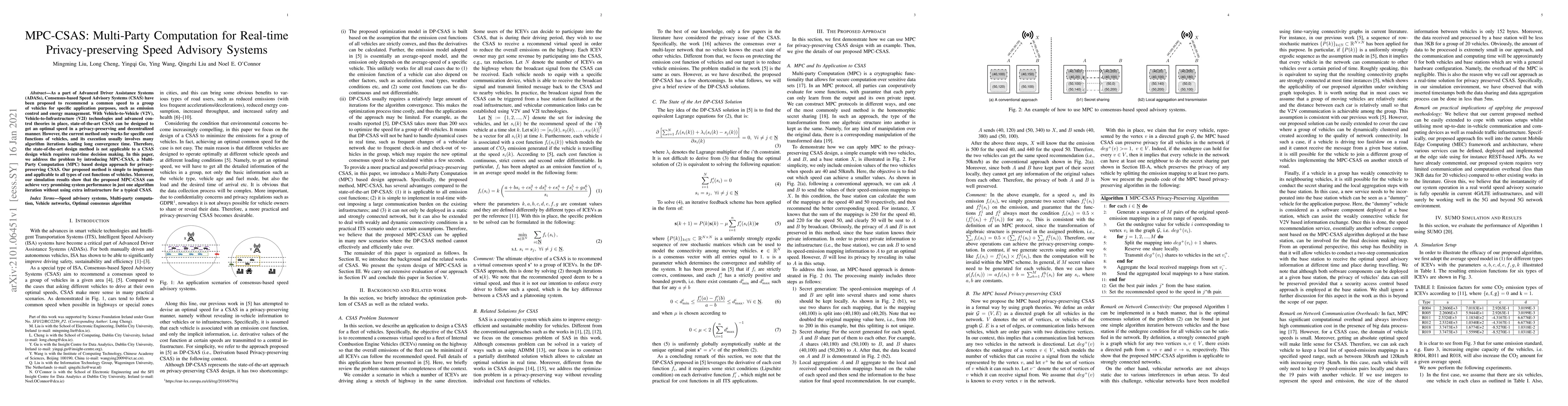 As a part of Advanced Driver Assistance Systems (ADASs), Consensus-based Speed Advisory Systems (CSAS) have been proposed to recommend a common speed to a group of vehicles for specific application purposes, such as emission control and energy management. With Vehicle-to-Vehicle (V2V), Vehicle-to-Infrastructure (V2I) technologies and advanced control theories in place, state-of-the-art CSAS can be designed to get an optimal speed in a privacy-preserving and decentralized manner. However, the current method only works for specific cost functions of vehicles, and its execution usually involves many algorithm iterations leading long convergence time. Therefore, the state-of-the-art design method is not applicable to a CSAS design which requires real-time decision making. In this paper, we address the problem by introducing MPC-CSAS, a Multi-Party Computation (MPC) based design approach for privacy-preserving CSAS. Our proposed method is simple to implement and applicable to all types of cost functions of vehicles. Moreover, our simulation results show that the proposed MPC-CSAS can achieve very promising system performance in just one algorithm iteration without using extra infrastructure for a typical CSAS.