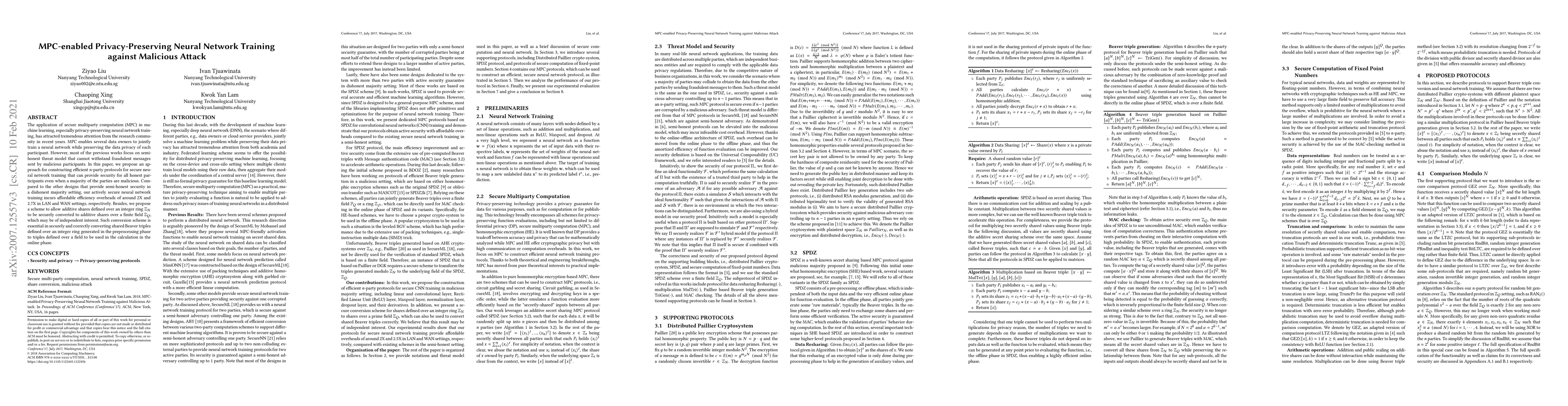 This paper proposes an actively secure multiparty computation (MPC) protocol for privacy-preserving neural network training that can handle malicious participants, contrasting with previous semi-honest models. The protocol achieves security for honest parties even when most participants are malicious, with efficiency overheads of around 2X and 2.7X in LAN and WAN settings, respectively.