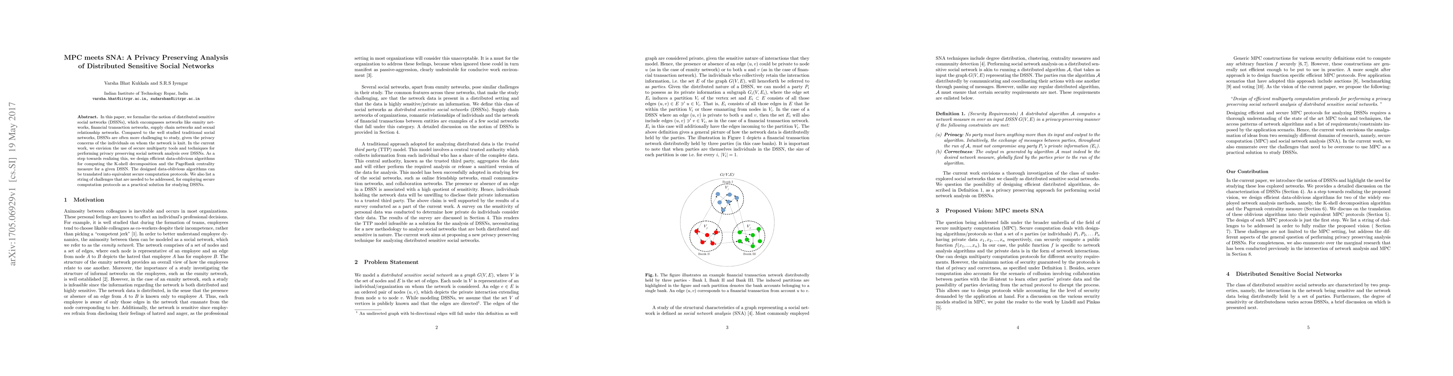 This paper formalizes distributed sensitive social networks (DSSNs) and proposes secure multiparty computation tools for privacy-preserving analysis. It designs efficient data-oblivious algorithms for K-shell decomposition and PageRank centrality, highlighting challenges for practical implementation.