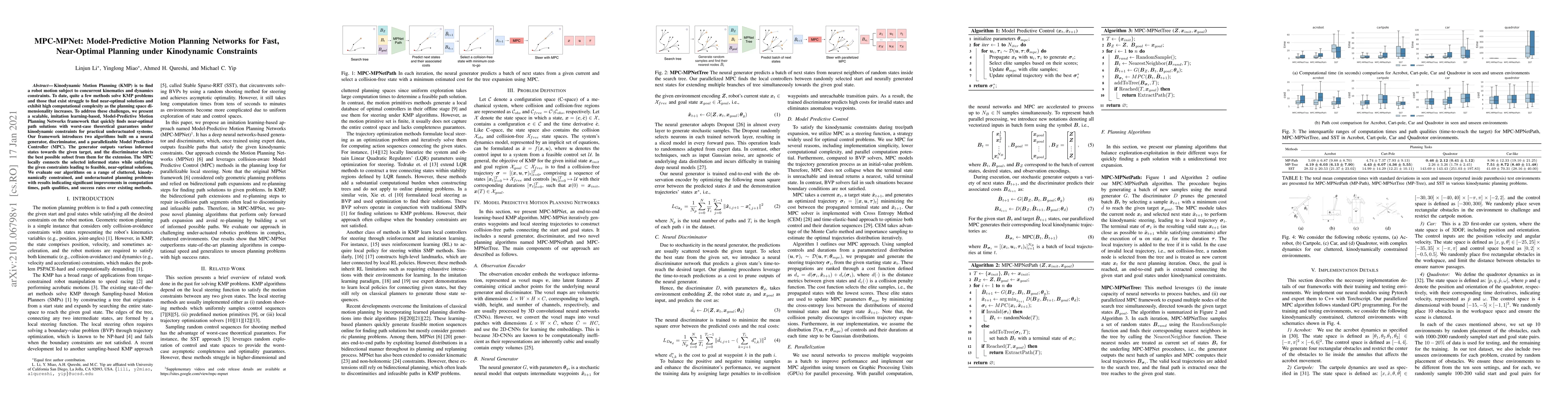 Kinodynamic Motion Planning (KMP) is to find a robot motion subject to concurrent kinematics and dynamics constraints. To date, quite a few methods solve KMP problems and those that exist struggle to find near-optimal solutions and exhibit high computational complexity as the planning space dimensionality increases. To address these challenges, we present a scalable, imitation learning-based, Model-Predictive Motion Planning Networks framework that quickly finds near-optimal path solutions with worst-case theoretical guarantees under kinodynamic constraints for practical underactuated systems. Our framework introduces two algorithms built on a neural generator, discriminator, and a parallelizable Model Predictive Controller (MPC). The generator outputs various informed states towards the given target, and the discriminator selects the best possible subset from them for the extension. The MPC locally connects the selected informed states while satisfying the given constraints leading to feasible, near-optimal solutions. We evaluate our algorithms on a range of cluttered, kinodynamically constrained, and underactuated planning problems with results indicating significant improvements in computation times, path qualities, and success rates over existing methods.