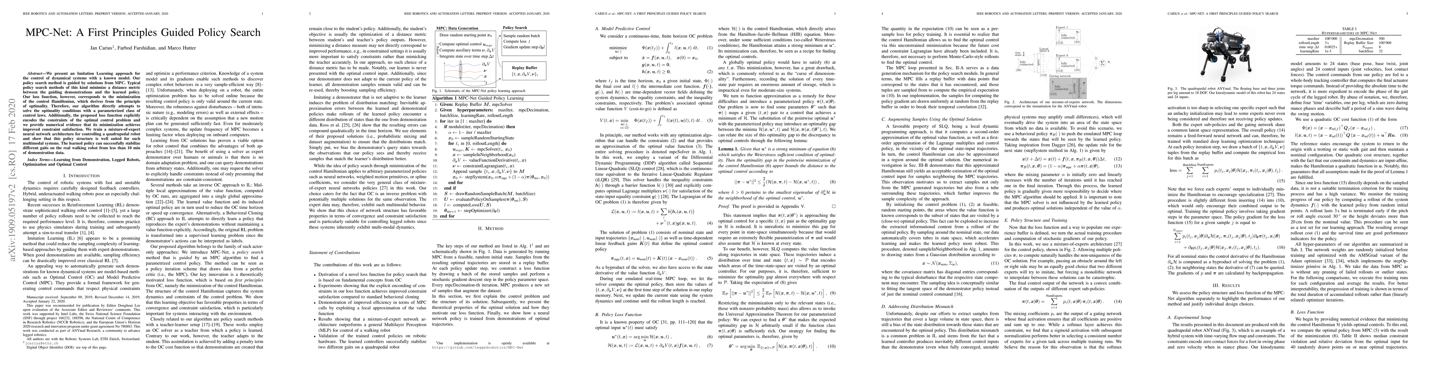 This research introduces MPC-Net, an Imitation Learning method for controlling dynamical systems using a known model. MPC-Net's policy search is guided by Model Predictive Control (MPC) solutions, minimizing the control Hamiltonian derived from optimality principles. Unlike typical methods, it directly attempts to solve optimality conditions with parameterized control laws, incorporating constraints into its loss function. Trained on a mixture-of-expert neural network, MPC-Net successfully stabilizes various gaits on a quadrupedal robot using minimal demonstration data.