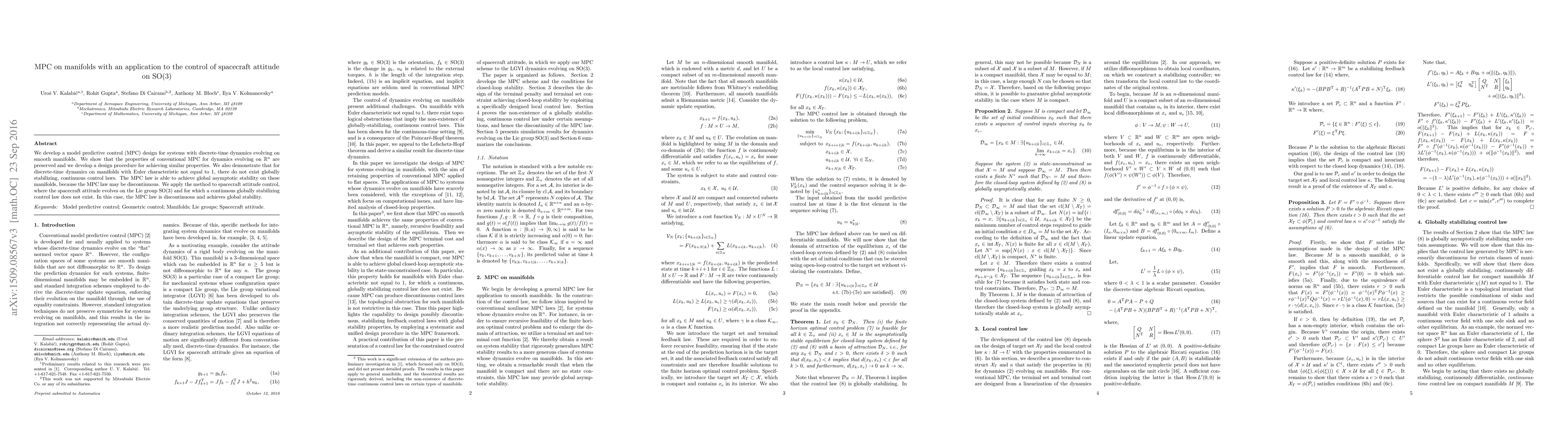 This paper develops a model predictive control (MPC) framework for systems on smooth manifolds, preserving conventional MPC properties. It demonstrates that MPC can achieve global stability on manifolds where continuous control laws cannot, and applies this method to spacecraft attitude control on SO(3).
