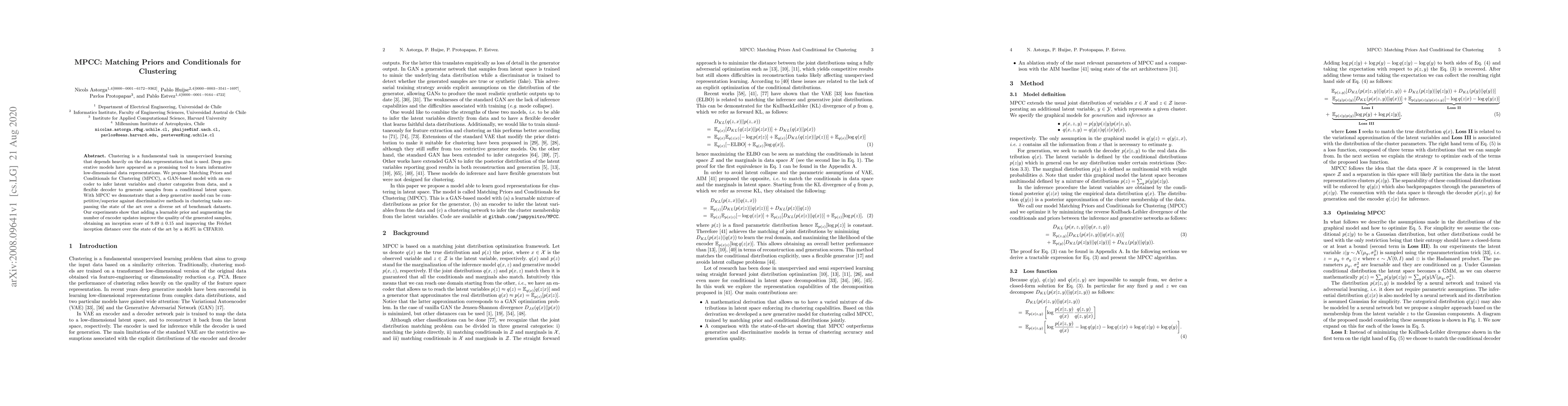 The MPCC model leverages a GAN-based approach to cluster data by learning latent variables and generating samples from a conditional latent space, achieving superior performance compared to discriminative methods on various benchmarks. Enhanced with a learnable prior and additional encoder updates, MPCC sets new state-of-the-art scores in sample quality and clustering accuracy.