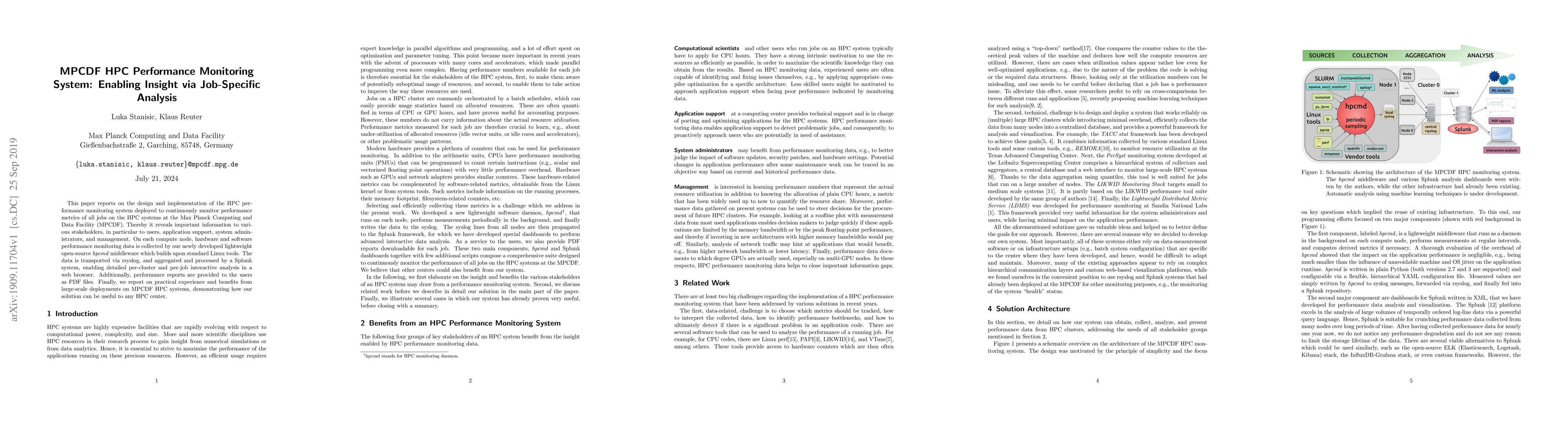 The paper describes a performance monitoring system for HPC systems at MPCDF, utilizing lightweight open-source middleware for data collection, aggregated via Splunk for detailed analysis, and providing users with interactive web-based insights and PDF reports. Practical experience from large-scale deployments highlights its utility for any HPC center.