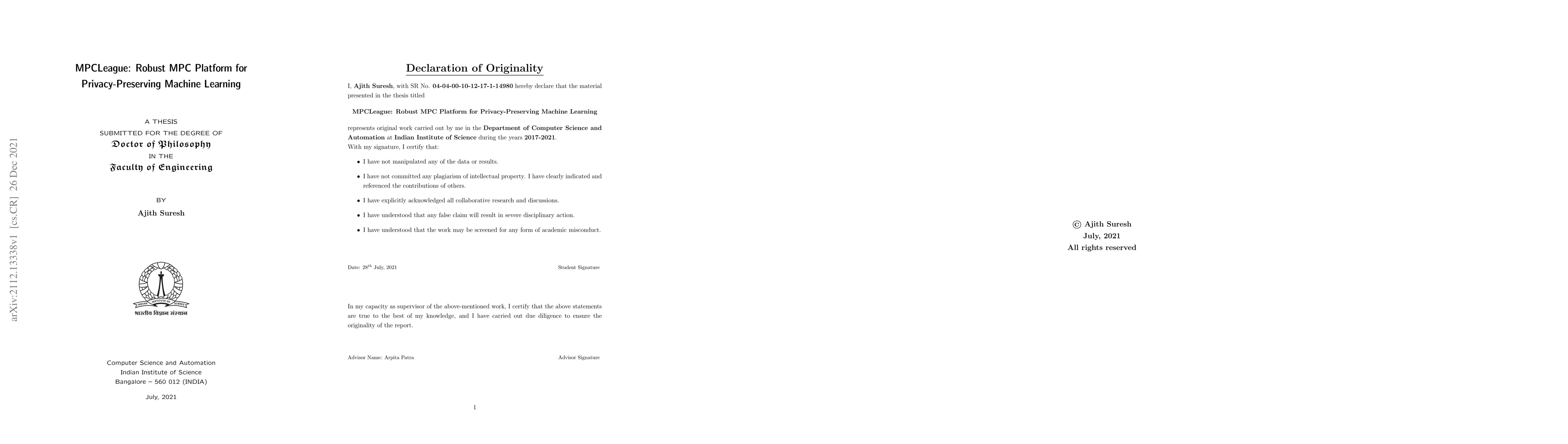 The primary technical contribution is the design and implementation of MPCLeague, an efficient and robust MPC platform for privacy-preserving machine learning, with tailored frameworks for 2-4 parties and support for ring structures.