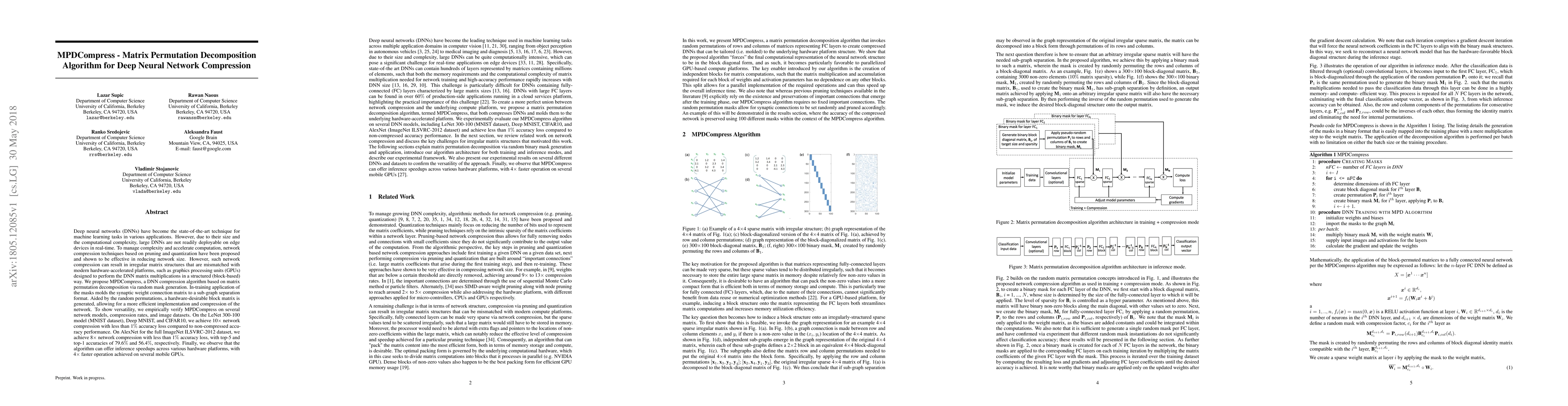 MPDCompress introduces a matrix permutation decomposition algorithm for deep neural network compression, transforming irregular matrices into structured block matrices for efficient hardware implementation. Empirical results show significant compression with minimal accuracy loss across various models and datasets, along with notable speedups on mobile GPUs.