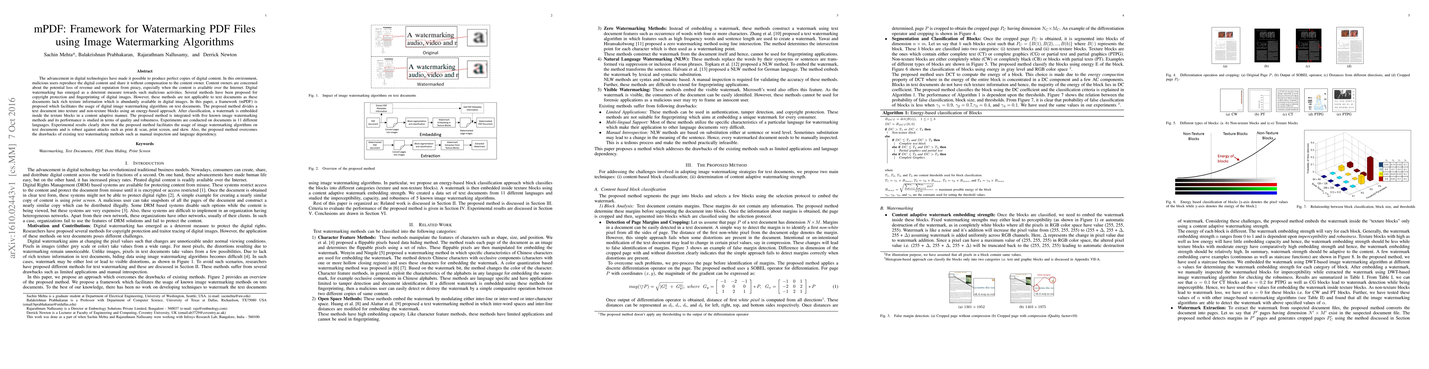 The paper proposes mPDF, a framework for embedding digital image watermarking algorithms into text documents, addressing the lack of texture information in text. The method divides documents into texture and non-texture blocks, embedding watermarks in texture blocks adaptively, and demonstrates robustness against various attacks while overcoming existing text watermarking limitations.