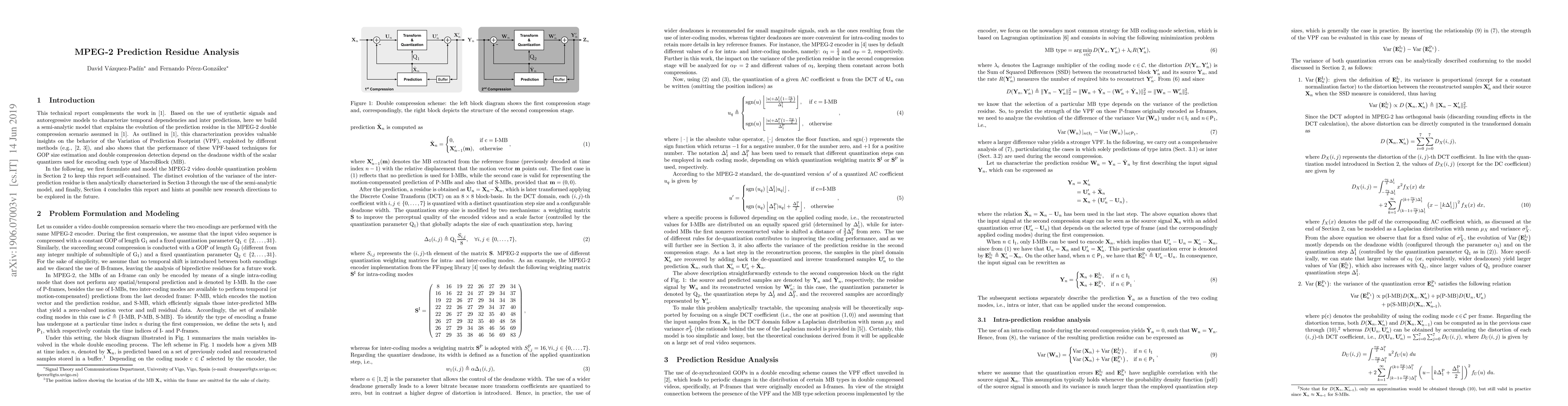 Based on the use of synthetic signals and autoregressive models to characterize temporal dependencies and inter prediction processes, a semi-analytic model is built to explain the evolution of the prediction residue in MPEG-2 double compressed video sequences. This characterization provides valuable insights on the behavior of the Variation of Prediction Footprint (VPF) exploited by different methods in the video forensics field, and also shows that the performance of the VPF-based techniques for GOP size estimation and double compression detection depend on the deadzone width of the scalar quantizers used for encoding each type of MacroBlock (MB).