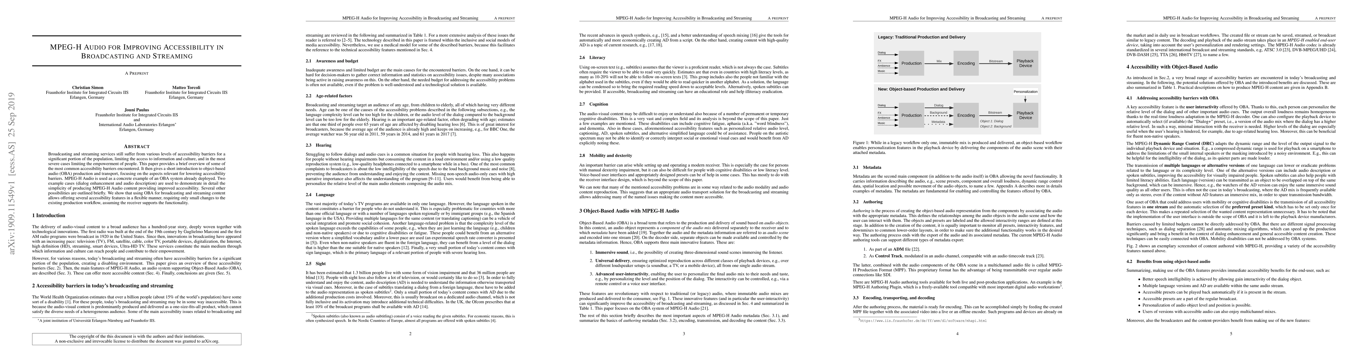 This paper explores how MPEG-H Audio can improve accessibility in broadcasting and streaming by enabling features like dialog enhancement and audio description with minimal changes to production workflows.