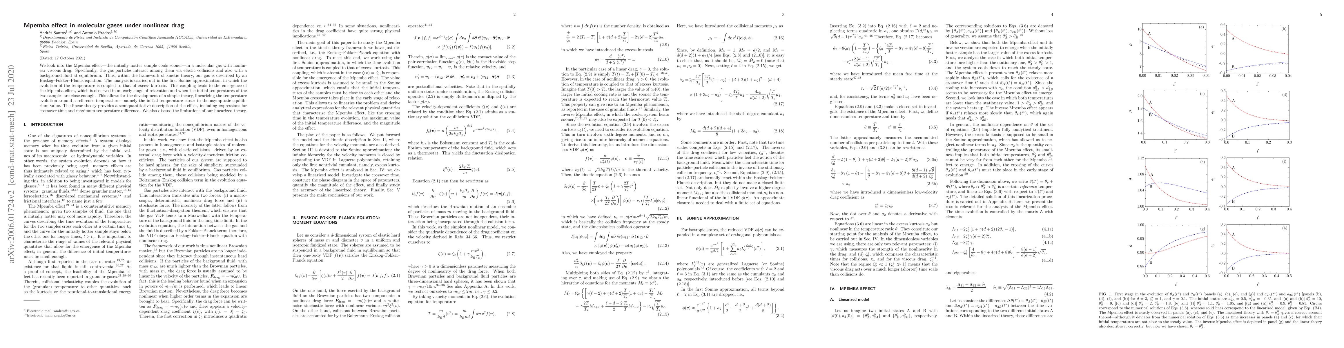 We look into the Mpemba effect---the initially hotter sample cools sooner---in a molecular gas with nonlinear viscous drag. Specifically, the gas particles interact among them via elastic collisions and also with a background fluid at equilibrium. Thus, within the framework of kinetic theory, our gas is described by an Enskog--Fokker--Planck equation. The analysis is carried out in the first Sonine approximation, in which the evolution of the temperature is coupled to that of the excess kurtosis. This coupling leads to the emergence of the Mpemba effect, which is observed in an early stage of the relaxation and when the initial temperatures of the two samples are close enough. This allows for the development of a simple theory, linearizing the temperature evolution around a reference temperature---namely the initial temperature closer to the asymptotic equilibrium value. The linear theory provides a semiquantitative description of the effect, including expressions for the crossover time and the maximum temperature difference. We also discuss the limitations of our linearized theory.