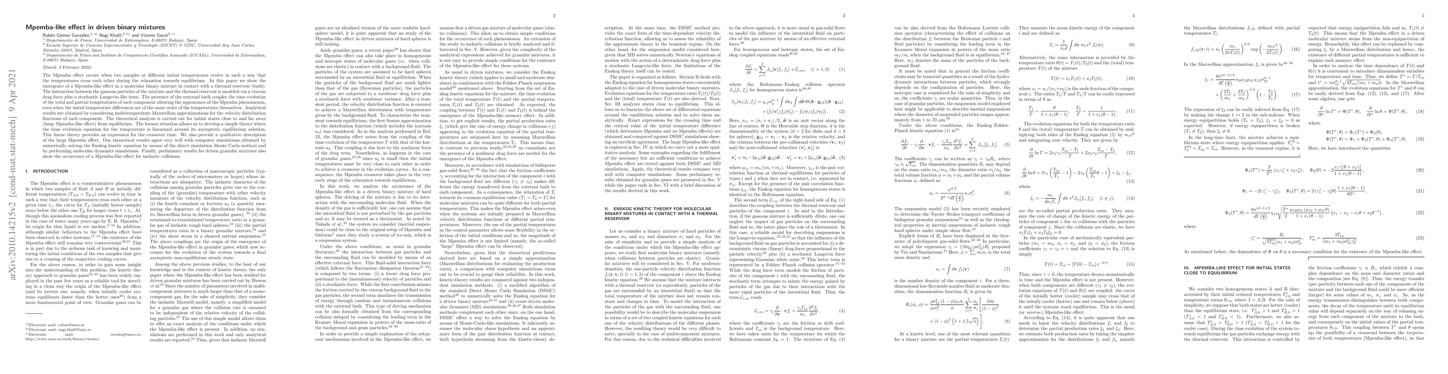 The paper presents a detailed theoretical framework for analyzing the Mpemba-like effect in driven binary mixtures, including the derivation of analytical expressions for the crossing time t*c.