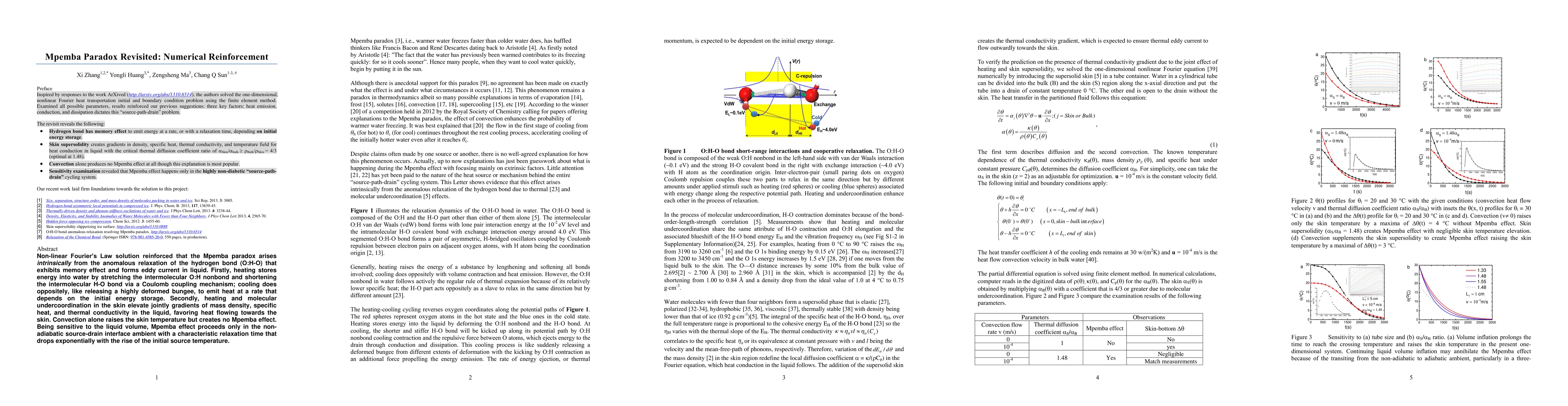 Inspired by responses to the work (arXiv:1310.6514), we solved the one-dimensional, nonlinear Fourier initial and boundary condition problem using the finite element method. Examination of all possible parameters reveals the following: 1. Hydrogen bond has memory effect to emit energy at a rate, or with a relaxation time, depending on initial energy storage. 2. Skin super-solidity creates gradients in thermal diffusion coefficient for heat conduction in liquid with the optimal skin-bulk ratio of 1.48. 3. Convection alone produces no such effect. 4. Mpemba effect happens only in the highly non-diabetic source-path-drain cycling system.