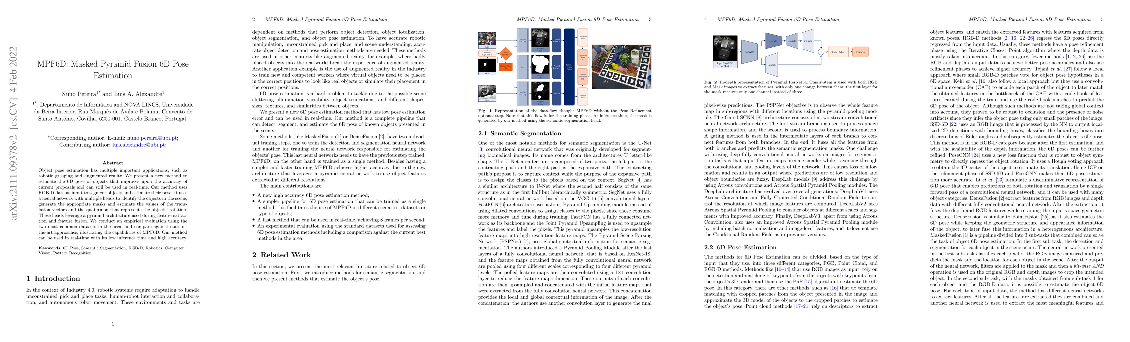 Object pose estimation has multiple important applications, such as robotic grasping and augmented reality. We present a new method to estimate the 6D pose of objects that improves upon the accuracy of current proposals and can still be used in real-time. Our method uses RGB-D data as input to segment objects and estimate their pose. It uses a neural network with multiple heads to identify the objects in the scene, generate the appropriate masks and estimate the values of the translation vectors and the quaternion that represents the objects' rotation. These heads leverage a pyramid architecture used during feature extraction and feature fusion. We conduct an empirical evaluation using the two most common datasets in the area, and compare against state-of-the-art approaches, illustrating the capabilities of MPF6D. Our method can be used in real-time with its low inference time and high accuracy.