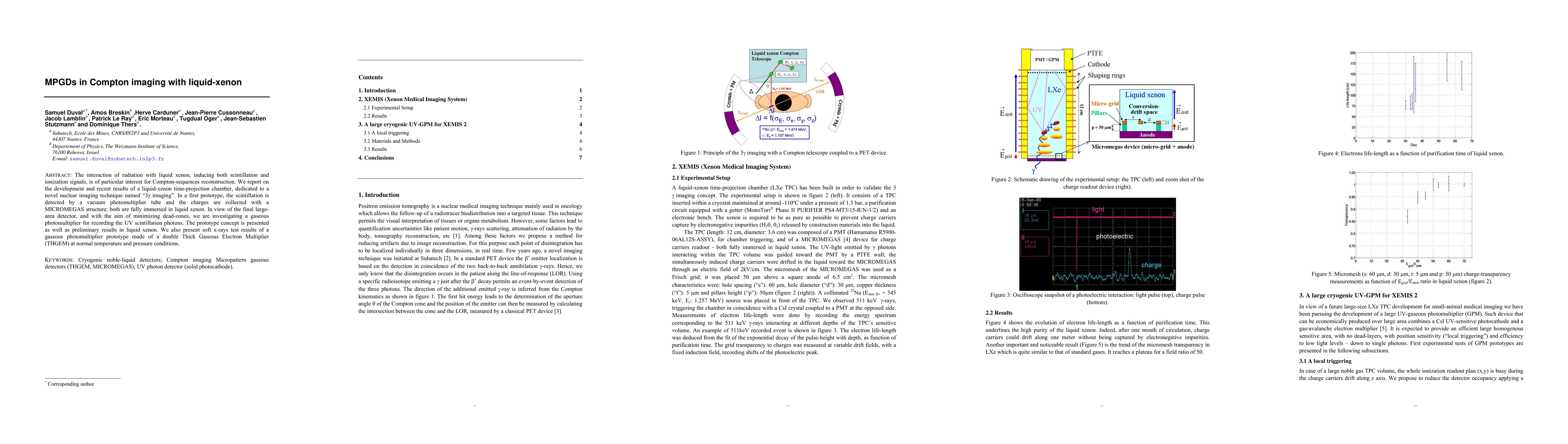 The interaction of radiation with liquid xenon, inducing both scintillation and ionization signals, is of particular interest for Compton-sequences reconstruction. We report on the development and recent results of a liquid-xenon time-projection chamber, dedicated to a novel nuclear imaging technique named "3 gamma imaging". In a first prototype, the scintillation is detected by a vacuum photomultiplier tube and the charges are collected with a MICROMEGAS structure; both are fully immersed in liquid xenon. In view of the final large-area detector, and with the aim of minimizing dead-zones, we are investigating a gaseous photomultiplier for recording the UV scintillation photons. The prototype concept is presented as well as preliminary results in liquid xenon. We also present soft x-rays test results of a gaseous photomultiplier prototype made of a double Thick Gaseous Electron Multiplier (THGEM) at normal temperature and pressure conditions.