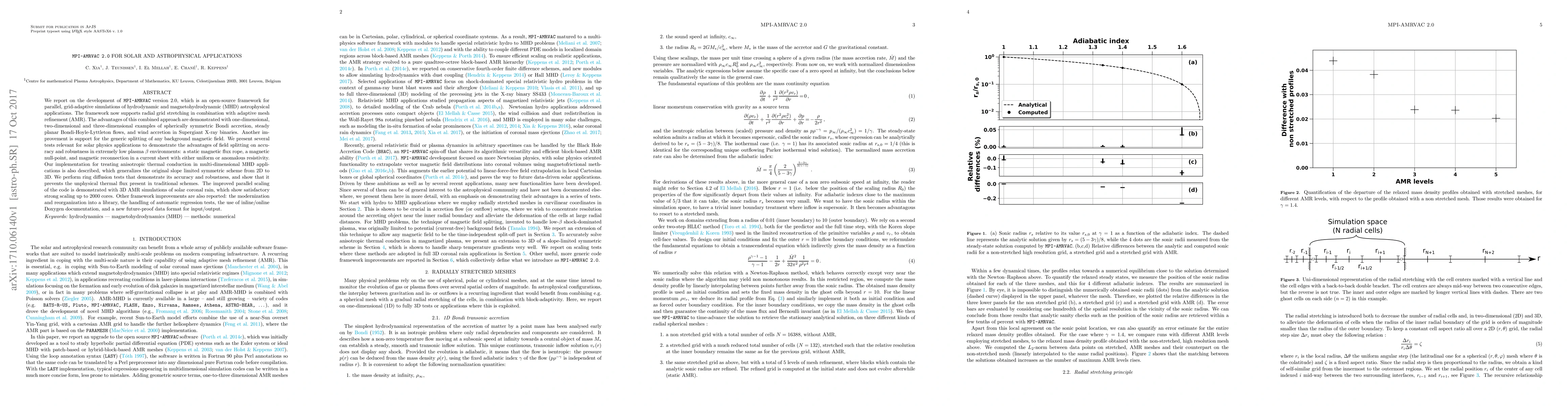 We report on the development of MPI-AMRVAC version 2.0, which is an open-source framework for parallel, grid-adaptive simulations of hydrodynamic and magnetohydrodynamic (MHD) astrophysical applications. The framework now supports radial grid stretching in combination with adaptive mesh refinement (AMR). The advantages of this combined approach are demonstrated with one-dimensional, two-dimensional and three-dimensional examples of spherically symmetric Bondi accretion, steady planar Bondi-Hoyle-Lyttleton flows, and wind accretion in Supergiant X-ray binaries. Another improvement is support for the generic splitting of any background magnetic field. We present several tests relevant for solar physics applications to demonstrate the advantages of field splitting on accuracy and robustness in extremely low plasma $\beta$ environments: a static magnetic flux rope, a magnetic null-point, and magnetic reconnection in a current sheet with either uniform or anomalous resistivity. Our implementation for treating anisotropic thermal conduction in multi-dimensional MHD applications is also described, which generalizes the original slope limited symmetric scheme from 2D to 3D. We perform ring diffusion tests that demonstrate its accuracy and robustness, and show that it prevents the unphysical thermal flux present in traditional schemes. The improved parallel scaling of the code is demonstrated with 3D AMR simulations of solar coronal rain, which show satisfactory strong scaling up to 2000 cores. Other framework improvements are also reported: the modernization and reorganization into a library, the handling of automatic regression tests, the use of inline/online Doxygen documentation, and a new future-proof data format for input/output