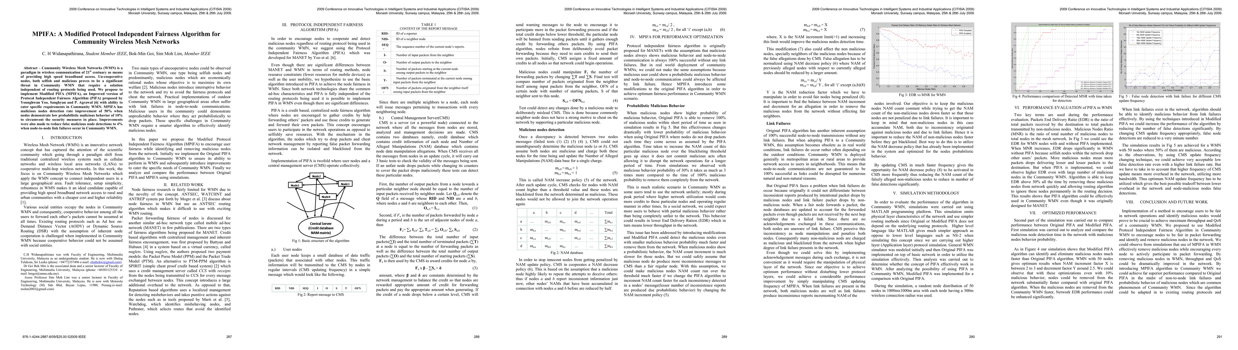 The paper proposes MPIFA, a refined Protocol Independent Fairness Algorithm for Community Wireless Mesh Networks, which enhances the detection of malicious nodes by 50% and reduces false positives to 4% during link failures. This solution aims to address security issues in wireless networks without relying on specific routing protocols.