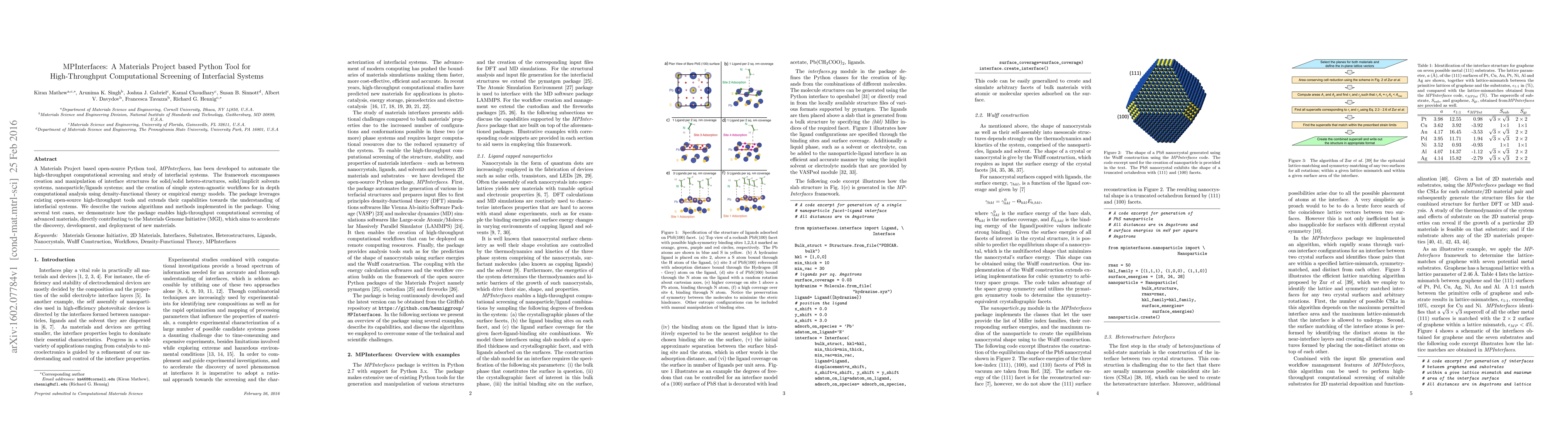 MPInterfaces is an open-source Python tool developed for automated high-throughput computational screening of interfacial systems, leveraging the Materials Project database. It supports analysis of solid/solid, solid/solvent, and nanoparticle/ligand interfaces using density-functional theory or empirical models, aiding in the Materials Genome Initiative.