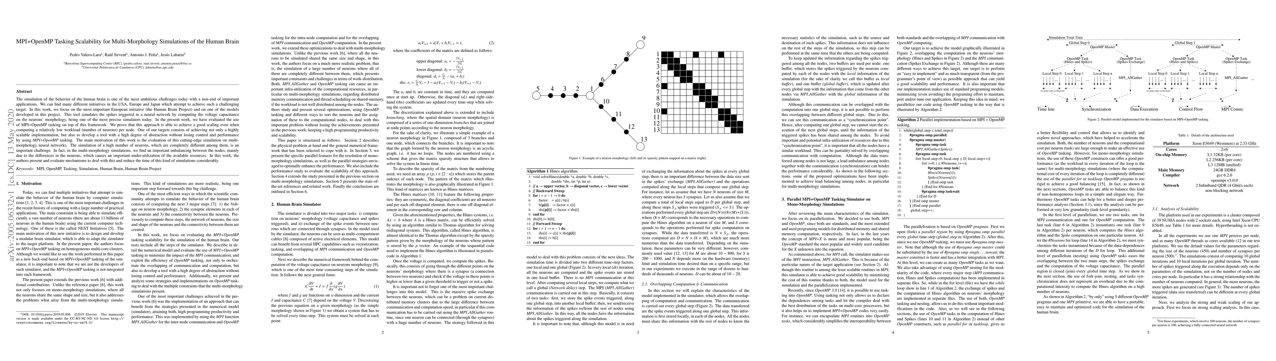 The simulation of the behavior of the human brain is one of the most ambitious challenges today with a non-end of important applications. We can find many different initiatives in the USA, Europe and Japan which attempt to achieve such a challenging target. In this work, we focus on the most important European initiative (the Human Brain Project) and on one of the models developed in this project. This tool simulates the spikes triggered in a neural network by computing the voltage capacitance on the neurons' morphology, being one of the most precise simulators today. In the present work, we have evaluated the use of MPI+OpenMP tasking on top of this framework. We prove that this approach is able to achieve a good scaling even when computing a relatively low workload (number of neurons) per node. One of our targets consists of achieving not only a highly scalable implementation, but also to develop a tool with a high degree of abstraction without losing control and performance by using \emph{MPI+OpenMP} tasking. The main motivation of this work is the evaluation of this cutting-edge simulation on multi-morphology neural networks. The simulation of a high number of neurons, which are completely different among them, is an important challenge. In fact, in the multi-morphology simulations, we find an important unbalancing between the nodes, mainly due to the differences in the neurons, which causes an important under-utilization of the available resources. In this work, the authors present and evaluate mechanisms to deal with this and reduce the time of this kind of simulations considerably.