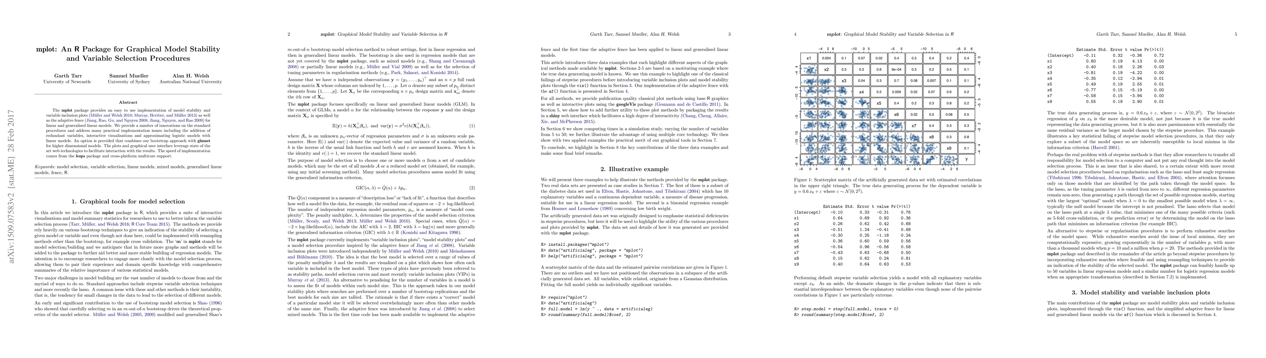 The mplot package provides an easy to use implementation of model stability and variable inclusion plots (M\"uller and Welsh 2010; Murray, Heritier, and M\"uller 2013) as well as the adaptive fence (Jiang, Rao, Gu, and Nguyen 2008; Jiang, Nguyen, and Rao 2009) for linear and generalised linear models. We provide a number of innovations on the standard procedures and address many practical implementation issues including the addition of redundant variables, interactive visualisations and approximating logistic models with linear models. An option is provided that combines our bootstrap approach with glmnet for higher dimensional models. The plots and graphical user interface leverage state of the art web technologies to facilitate interaction with the results. The speed of implementation comes from the leaps package and cross-platform multicore support.