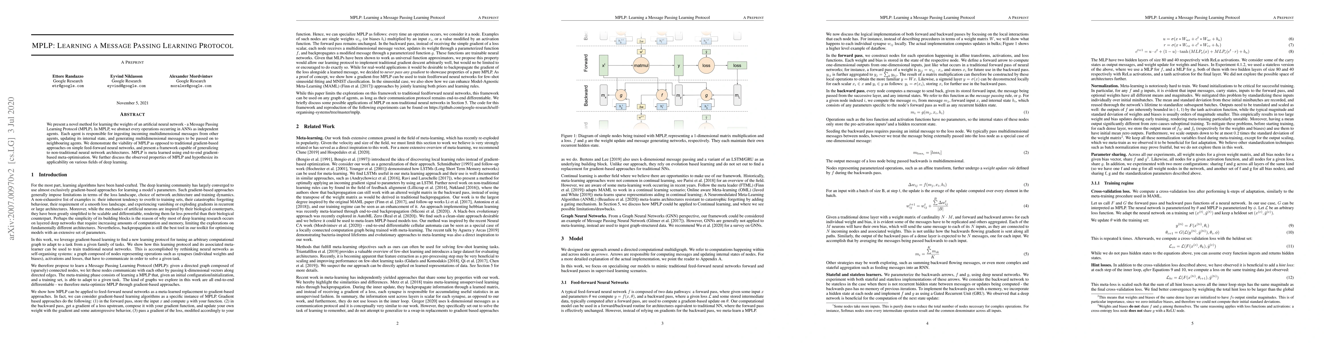 The paper introduces a novel Message Passing Learning Protocol (MPLP) for learning neural network weights, where operations are abstracted as independent agents that pass multidimensional messages. MPLP is shown to be viable for feed-forward networks and is meta-learned using gradient-based optimization, with potential for broader deep learning applications.