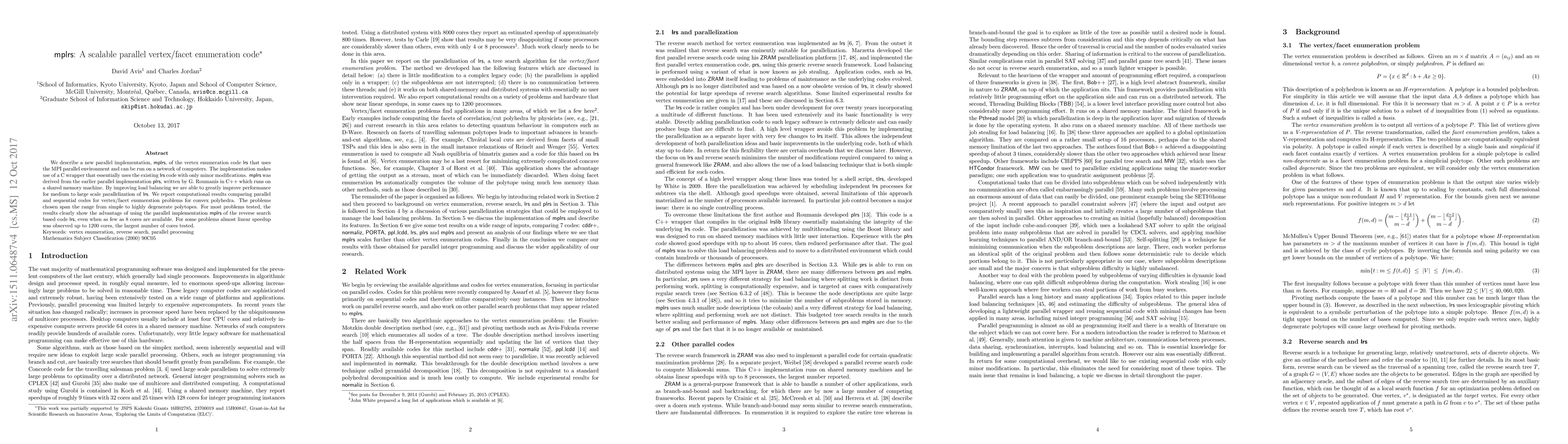 The paper introduces mplrs, a scalable parallel implementation of the vertex enumeration code lrs using MPI, which significantly improves parallel performance through a budgeting method. Preliminary results show significant speedup over sequential codes, especially with as few as 8 cores, and near-linear scaling up to 1200 cores.