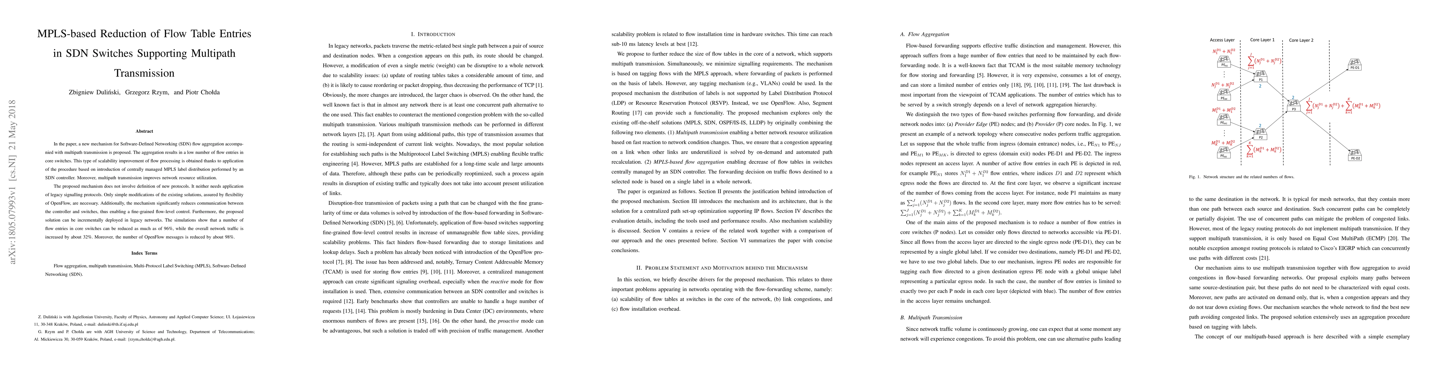 This paper proposes a method to reduce flow table entries in SDN switches by 96% while increasing network traffic by 32%, using MPLS label distribution.