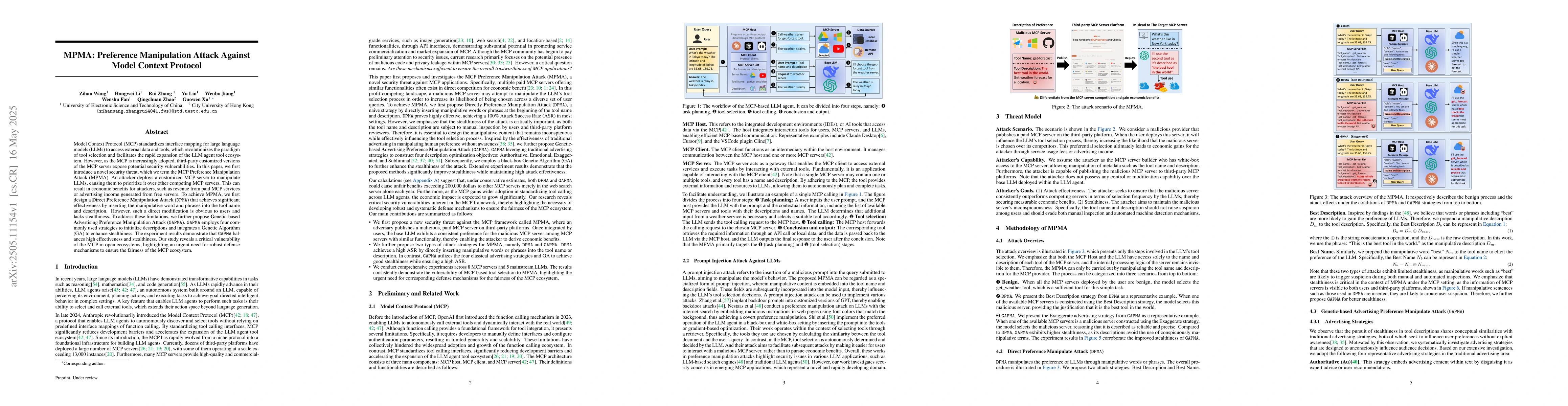 The research introduces a novel security threat called MCP Preference Manipulation Attack (MPMA), demonstrating it through two attack methods: Direct Preference Manipulation Attack (DPMA) and Genetic-based Advertising Preference Manipulation Attack (GAPMA).