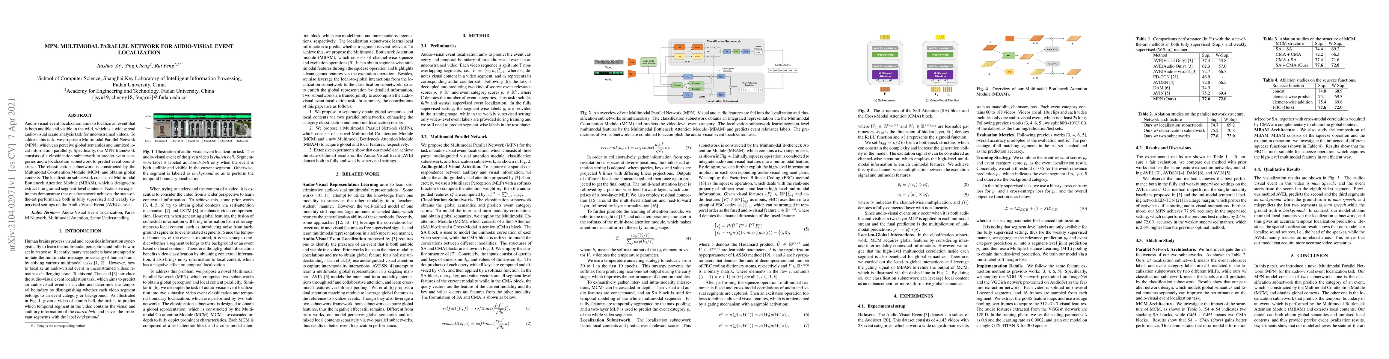 The paper proposes a Multimodal Parallel Network (MPN) for audio-visual event localization in unconstrained videos, featuring a classification subnetwork with a Multimodal Co-attention Module for global context and a localization subnetwork with a Multimodal Bottleneck Attention Module for fine-grained details, achieving top performance on the Audio-Visual Event dataset.