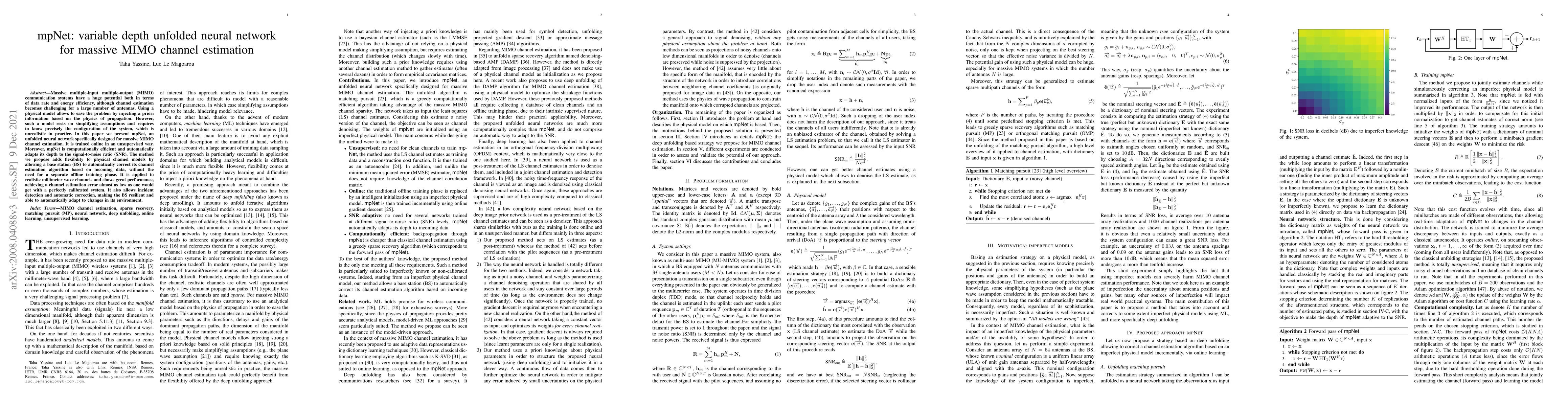 mpNet is an unsupervised, variable depth neural network designed for massive MIMO channel estimation, achieving performance close to perfectly calibrated systems while adapting its depth based on signal-to-noise ratio, and enabling automatic incident detection and correction.