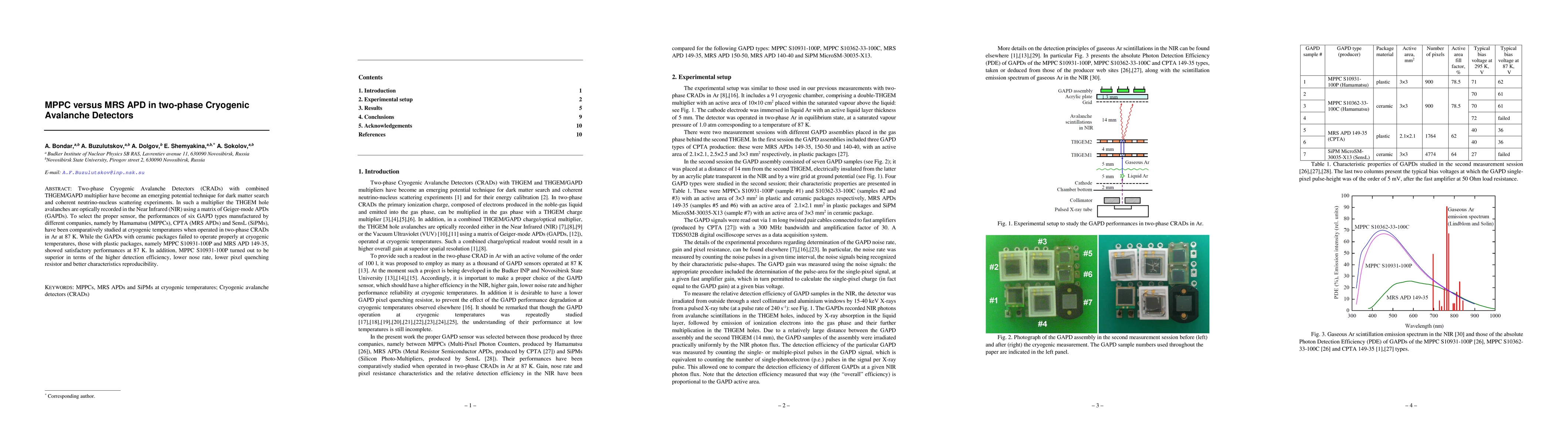 This paper compares the performance of six Geiger-mode APD types, including MPPCs and MRS APDs, in two-phase Cryogenic Avalanche Detectors (CRADs) for dark matter and neutrino experiments. MPPC S10931-100P demonstrated superior detection efficiency, lower noise, and better reproducibility compared to MRS APD 149-35 at cryogenic temperatures.