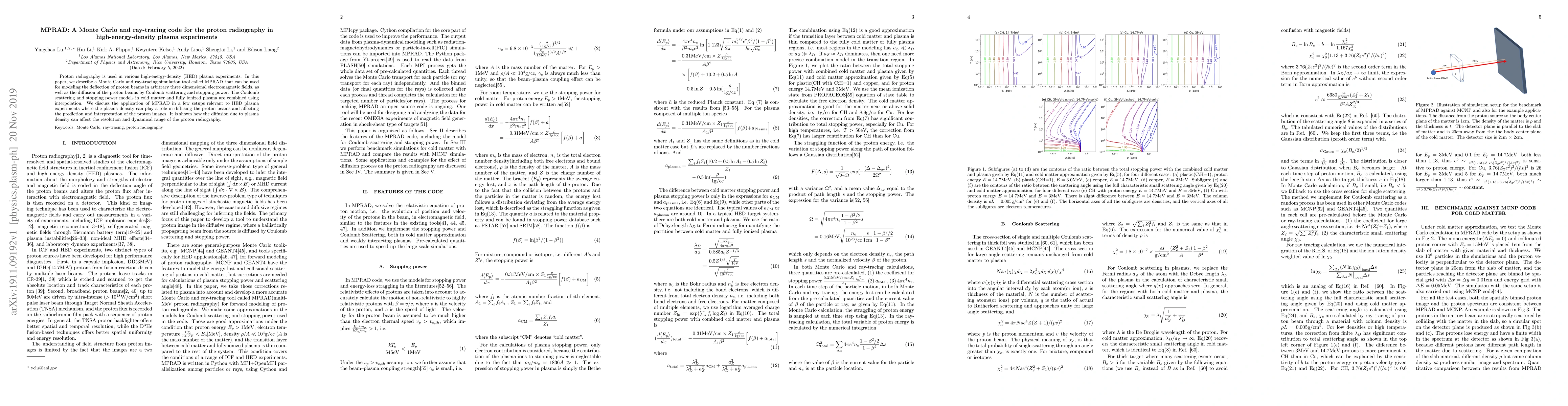 MPRAD is a Monte Carlo and ray-tracing simulation tool designed for modeling proton beam deflection and diffusion in high-energy-density plasma experiments. It combines Coulomb scattering and stopping power models for both cold matter and fully ionized plasma, demonstrating its application in scenarios where plasma density influences proton beam diffusion and affects the interpretation of proton radiography images.