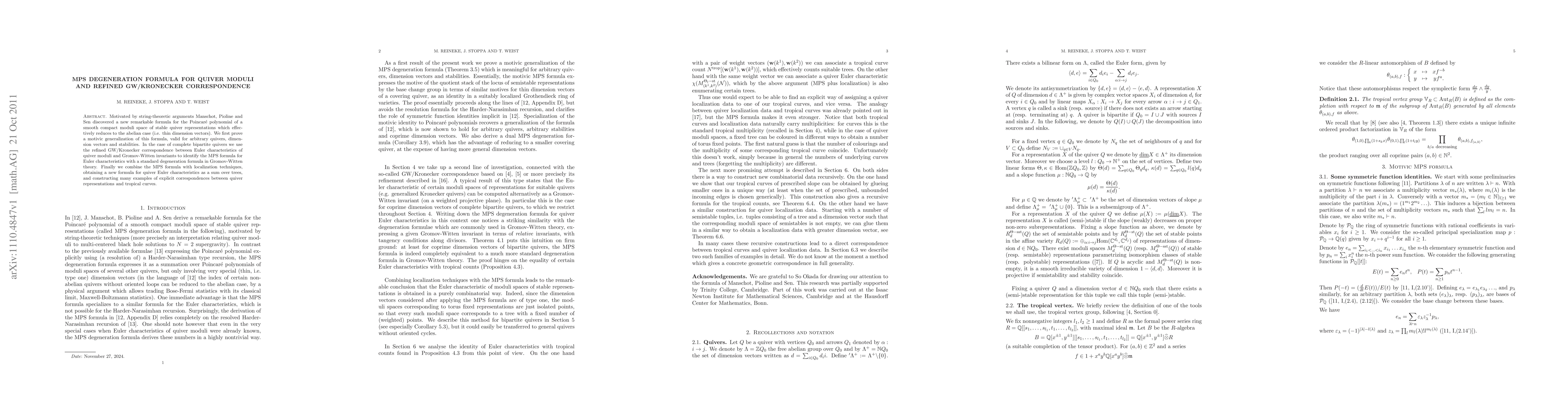 Motivated by string-theoretic arguments Manschot, Pioline and Sen discovered a new remarkable formula for the Poincare polynomial of a smooth compact moduli space of stable quiver representations which effectively reduces to the abelian case (i.e. thin dimension vectors). We first prove a motivic generalization of this formula, valid for arbitrary quivers, dimension vectors and stabilities. In the case of complete bipartite quivers we use the refined GW/Kronecker correspondence between Euler characteristics of quiver moduli and Gromov-Witten invariants to identify the MPS formula for Euler characteristics with a standard degeneration formula in Gromov-Witten theory. Finally we combine the MPS formula with localization techniques, obtaining a new formula for quiver Euler characteristics as a sum over trees, and constructing many examples of explicit correspondences between quiver representations and tropical curves.