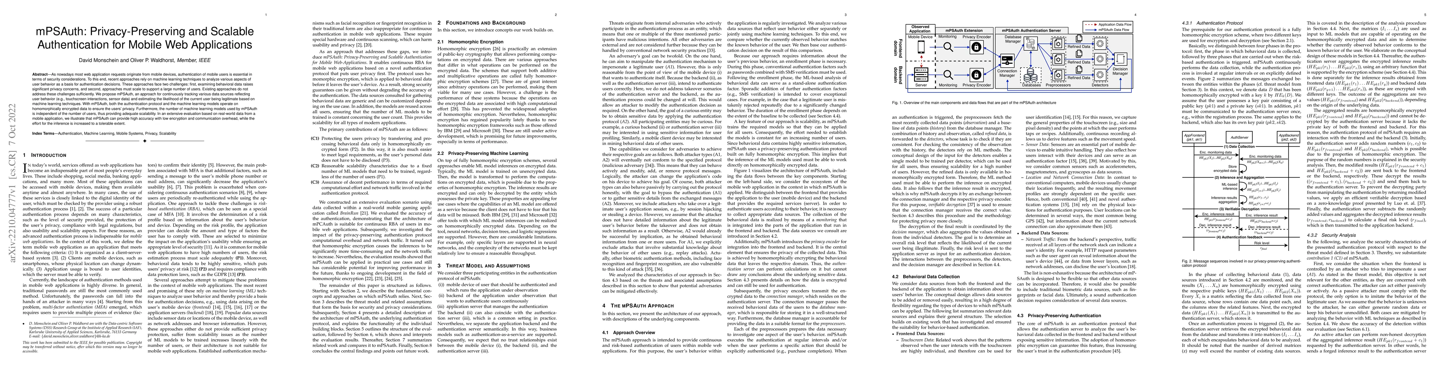mPSAuth proposes a privacy-preserving and scalable authentication method for mobile web applications using machine learning on encrypted data to address user behavior analysis while mitigating privacy concerns and scaling issues. Evaluations show high accuracy with manageable overhead and scalability.