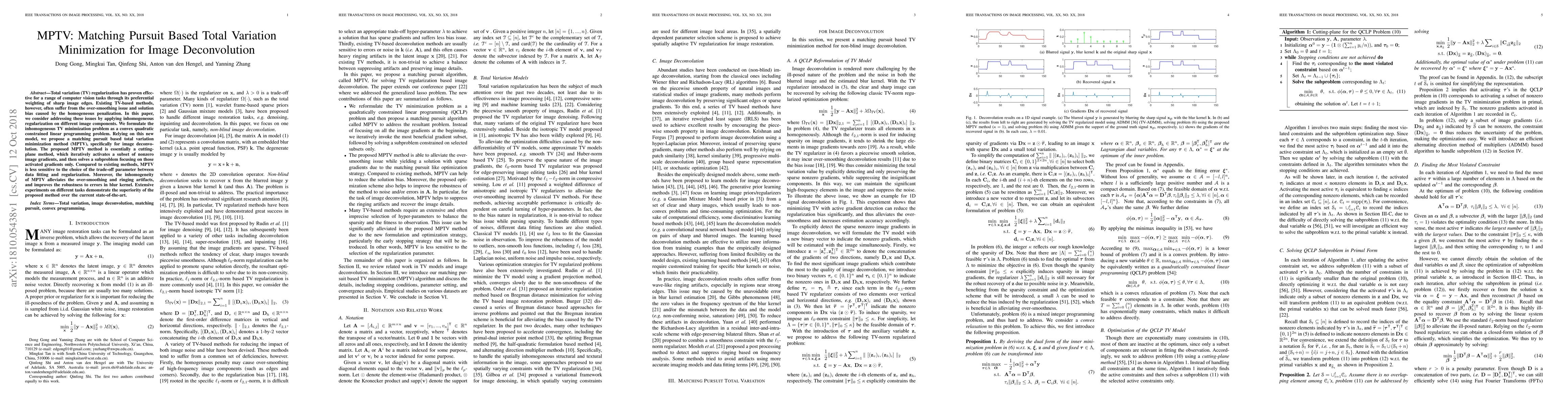 The paper proposes MPTV, a matching pursuit based total variation minimization method for image deconvolution, aiming to address over-smoothing and solution bias through inhomogeneous regularization. MPTV iteratively activates subsets of nonzero image gradients, showing improved robustness and reduced artifacts compared to existing methods.