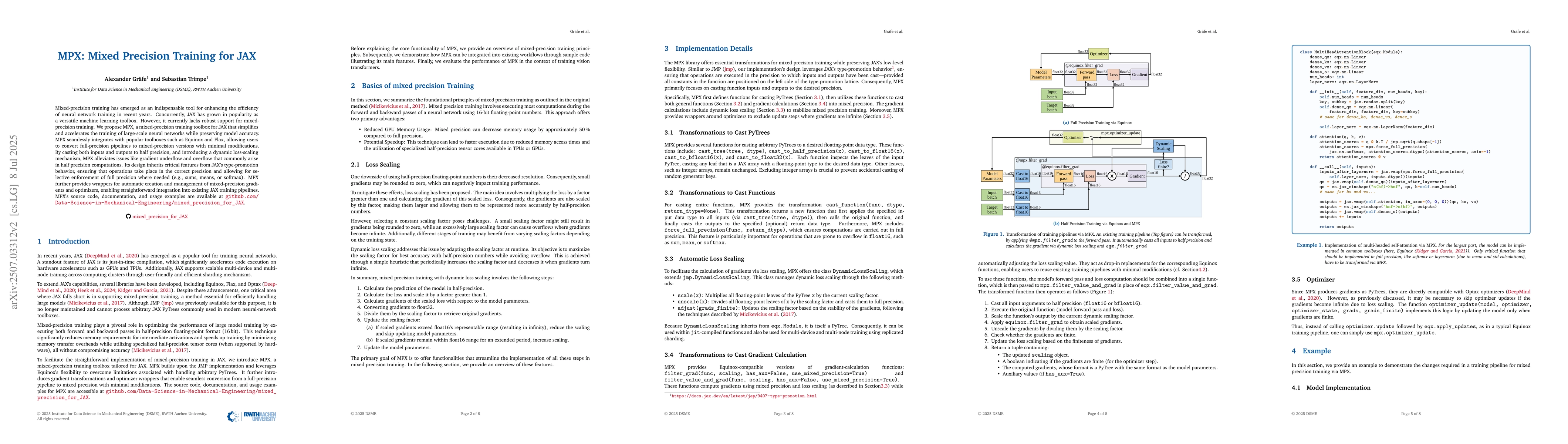 Mixed-precision training has emerged as an indispensable tool for enhancing the efficiency of neural network training in recent years. Concurrently, JAX has grown in popularity as a versatile machine learning toolbox. However, it currently lacks robust support for mixed-precision training. We propose MPX, a mixed-precision training toolbox for JAX that simplifies and accelerates the training of large-scale neural networks while preserving model accuracy. MPX seamlessly integrates with popular toolboxes such as Equinox and Flax, allowing users to convert full-precision pipelines to mixed-precision versions with minimal modifications. By casting both inputs and outputs to half precision, and introducing a dynamic loss-scaling mechanism, MPX alleviates issues like gradient underflow and overflow that commonly arise in half precision computations. Its design inherits critical features from JAX's type-promotion behavior, ensuring that operations take place in the correct precision and allowing for selective enforcement of full precision where needed (e.g., sums, means, or softmax). MPX further provides wrappers for automatic creation and management of mixed-precision gradients and optimizers, enabling straightforward integration into existing JAX training pipelines. MPX's source code, documentation, and usage examples are available at github.com/Data-Science-in-Mechanical-Engineering/mixed_precision_for_JAX .