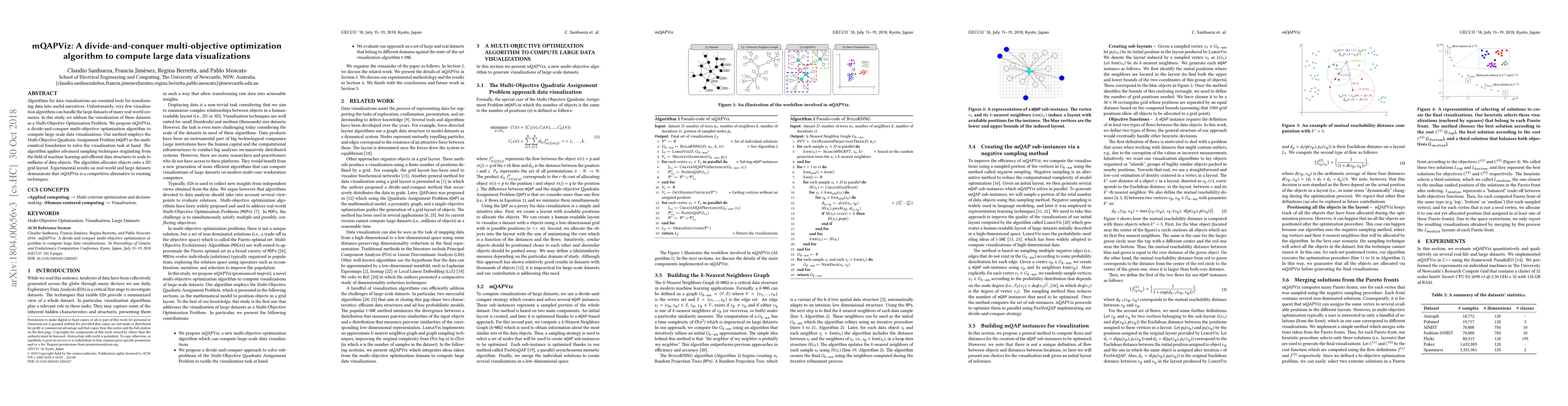 mQAPViz is a novel divide-and-conquer multi-objective optimization algorithm designed to efficiently visualize large datasets by employing the Multi-Objective Quadratic Assignment Problem. It leverages advanced sampling and efficient data structures to scale to millions of data objects, outperforming existing techniques in experimental evaluations.